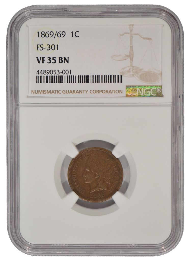 One 1869/69 Indian Cent NGC VF35BN.
