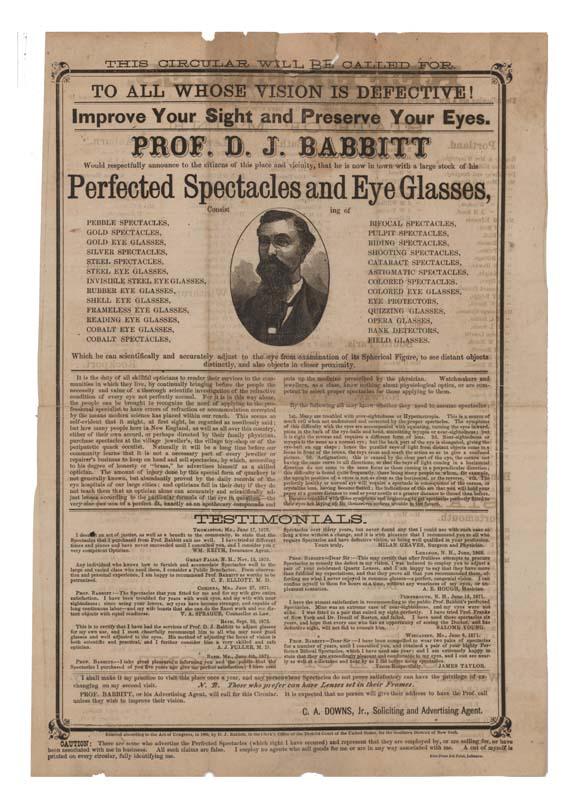 11” x 15 3/4” advertising circular. The circular reads, in part: To all whose vision is defective! Improve your sight and preserve your eyes. Prof. D.J. Babbitt would respectfully announce to the citizens of this place and vicinity, that he is now in town with a large stock of his Perfected Spectacles and Eye Glasses ... Which he can scientifically and accurately adjust to the ye from examination of its Spherical Figure, to see distance objects distinctly, and also objects in closer proximity ... Line engraving of Dr. Babbitt at center. The circular also offers a range of testimonials regarding Dr. Babbitt’s spectacles. Verso lists a large number of references from Maine, New Hampshire and Vermont. Some edge wear. Overall Fine.