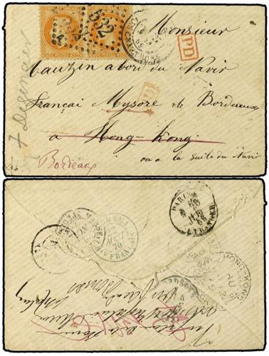 1869 Circulada a un marinero del buque francés "Mysore" en HONG-KONG, devuelta a BORDEAUX por no encontrar al destinatario. Al dorso fechadores HONG-KONG/MARINE/SINGAPORE TO HONG-KONG y YOKOHAMA/BAU. FRANÇAIS. MUY INTERESANTE Y RARA.