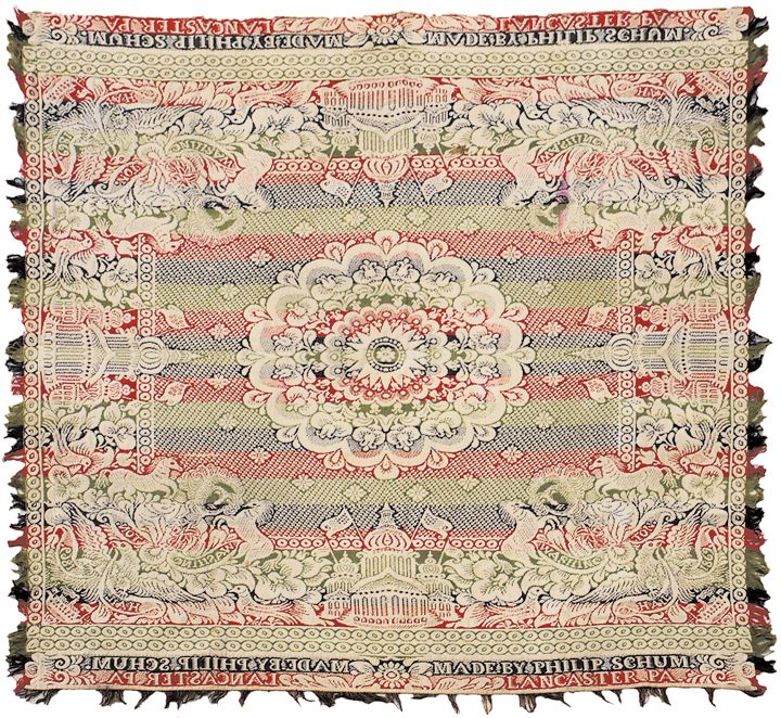 This vibrant red, green, blue, and tan Jacquard Coverlet measures 80” x 75” and features large busts of George Washington and horses, birds, and flowers. “MADE BY PHILIP SCHUM. LANCASTER. PA”, identified in several places throughout the coverlet. Coverlet has a fringe running along three sides, though a few bits are missing; in addition there are two stains, (one of them pink) and a hole. However, given that this textile is 140 years old it has been remarkably well preserved.
