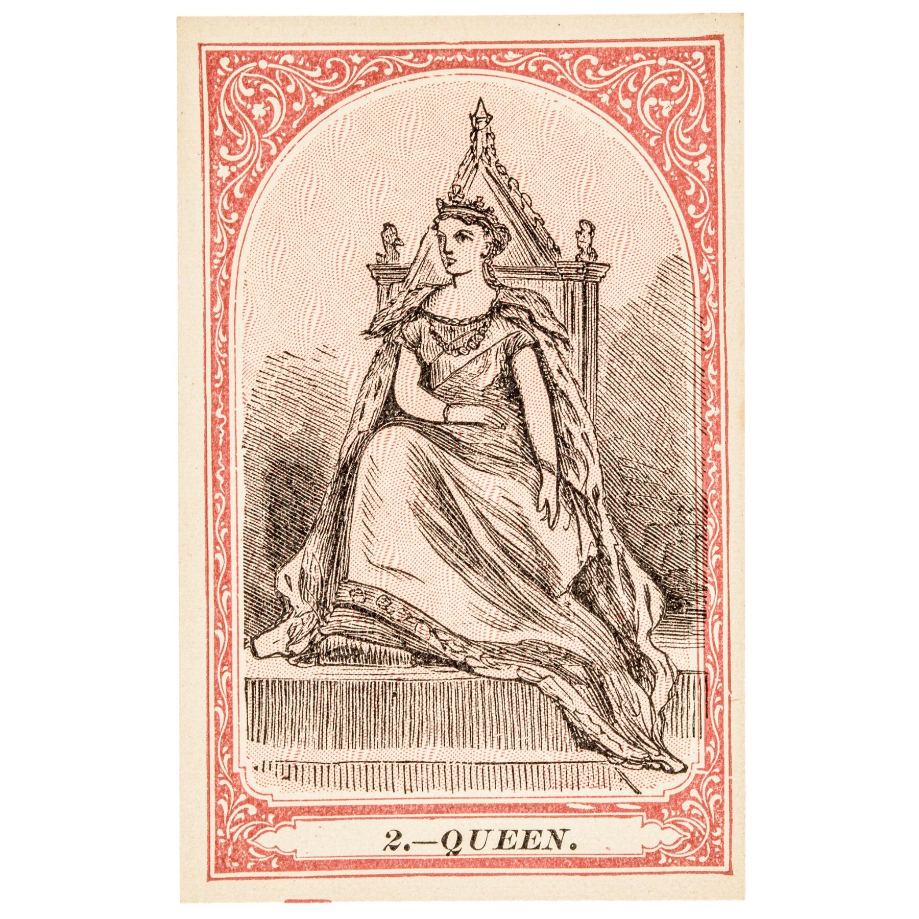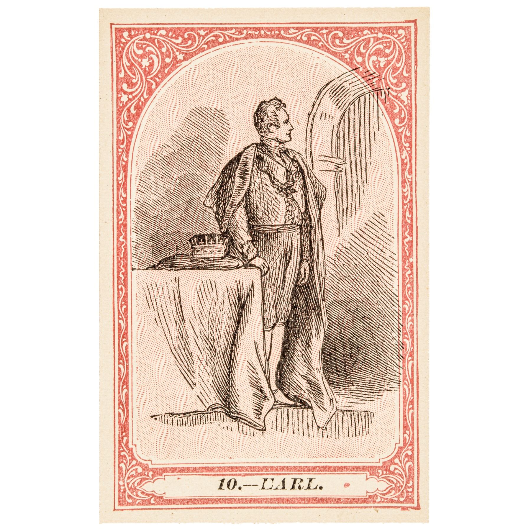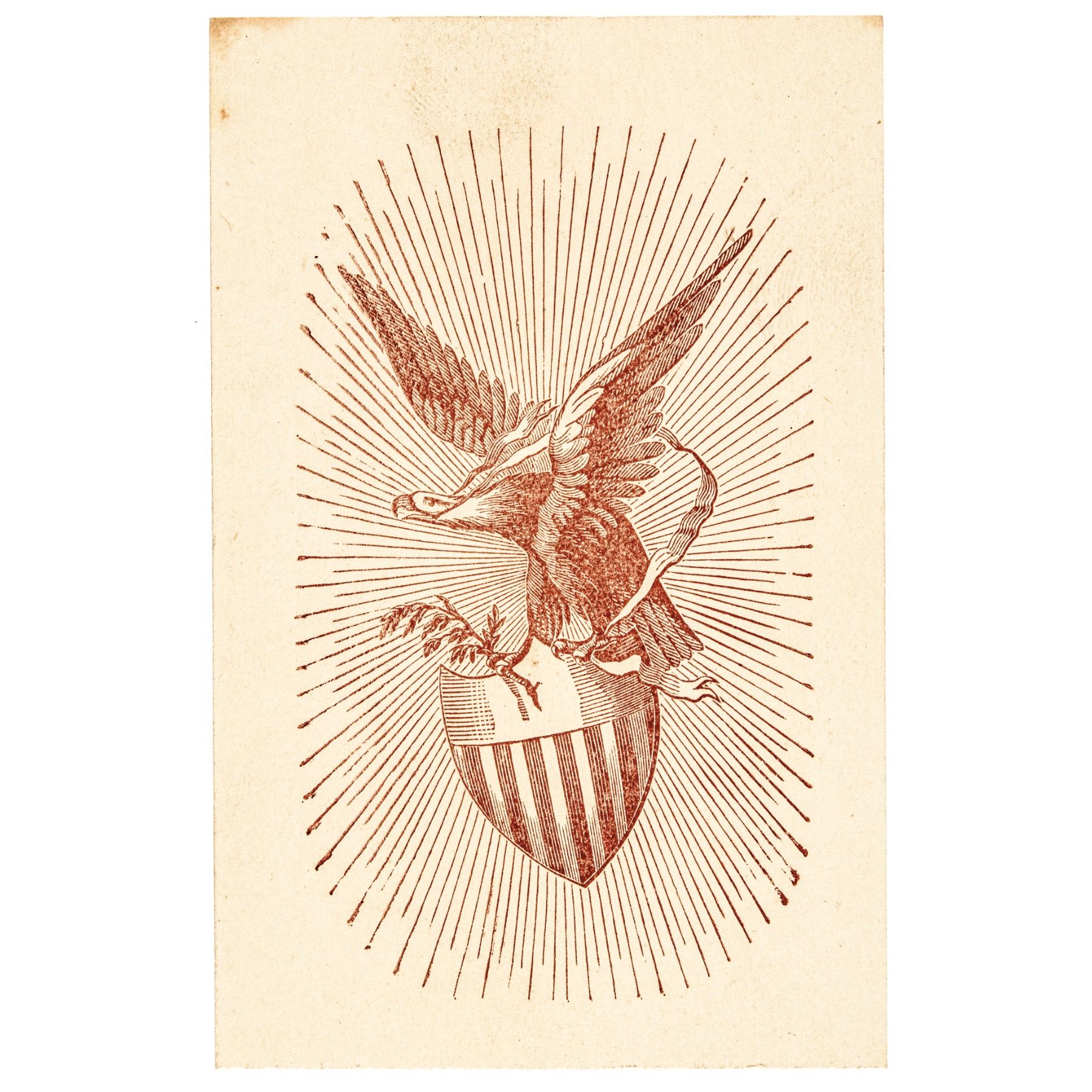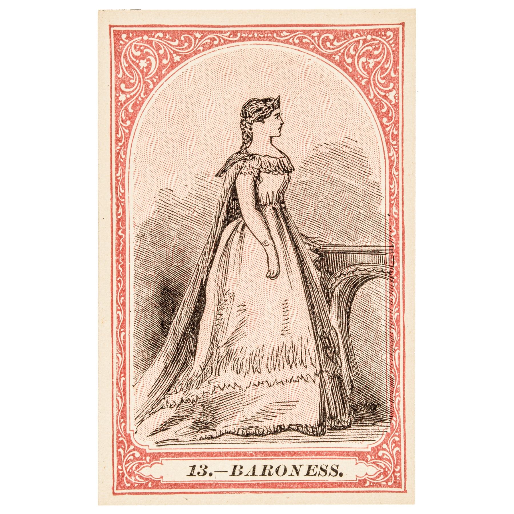 Very Rare Complete Game Deck of 56 Playing Cards including its Title card. The Title card reads: “Stevens Patent / Liberty. LAW. Protection. Habeas Corpus. / Patented Sep. 21, 1869.” There are four suits (silver, gold, red, and white) each having 14 imaged cards (1-King, 2-Queen, 3-Prince, 4-Princess, 5-Writ, 6-Sheriff, 7-Duke, 8-Duchess, 9-Marquis, 10-Earl, 11-Viscount, 12-Baron, 13-Baroness, 14-Little Tom). This highly Patriotic American designed backs are printed in brown displaying an American Heraldic Eagle with Shield. Overall quite excellent with no hint of wear on the cards. We previously sold a similar deck of 1869 Stevens Patent Playing Cards in our EAHA Auction of October 22, 2005, Lot 753 graded Near Mint with gilt edges, which brought $1,300. This Post Civil War Reconstruction Period political card game is Extremely Rare, especially in such excellent condition. The deck comes housed complete, still in its original paper wrapper which is slightly torn and somewhat soiled on the blank edge and back, not affecting the printed front.