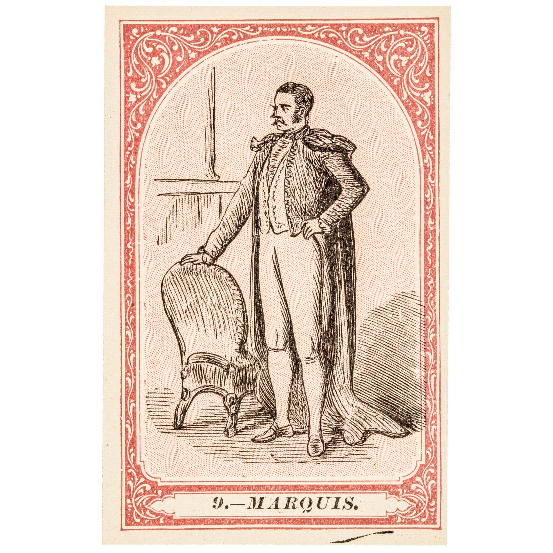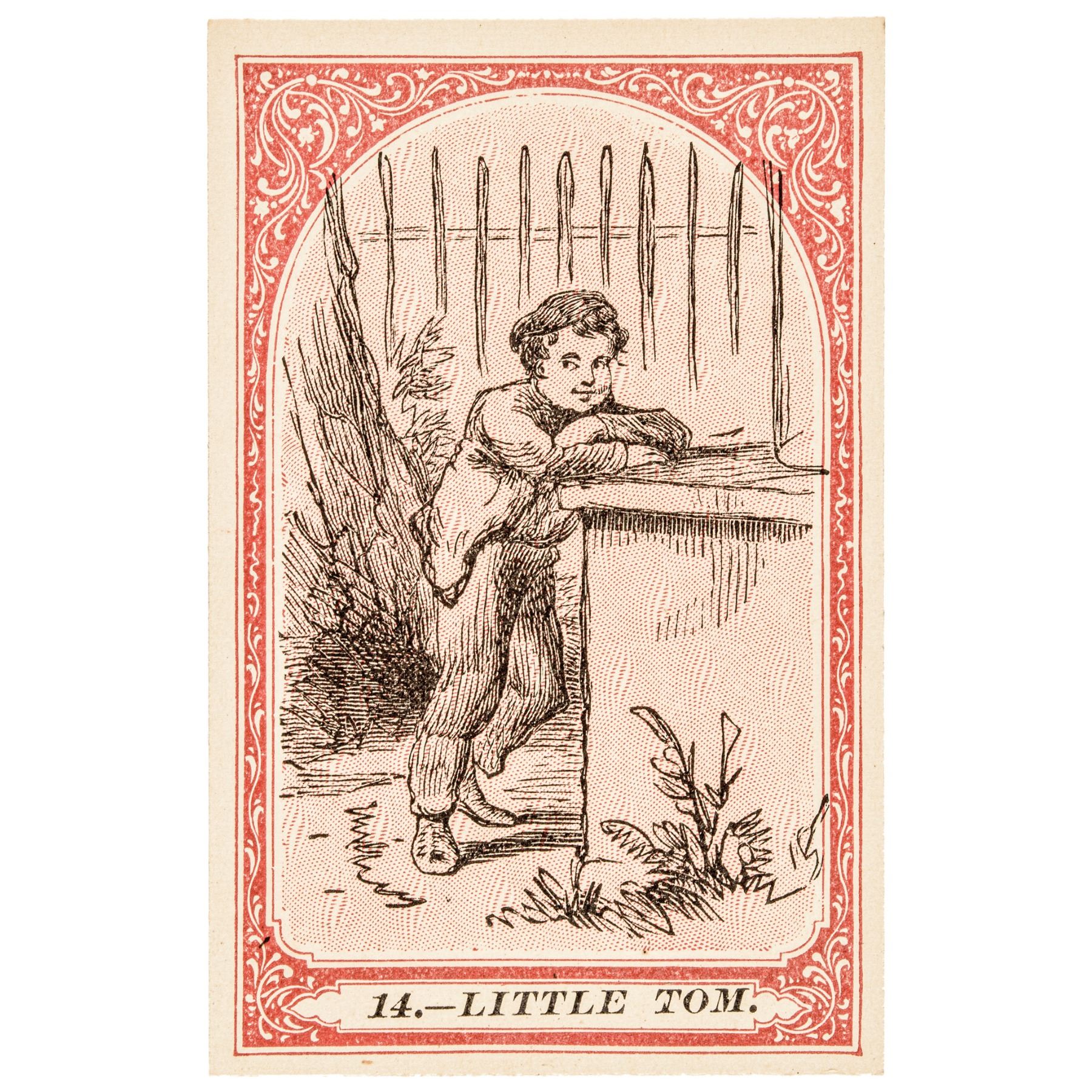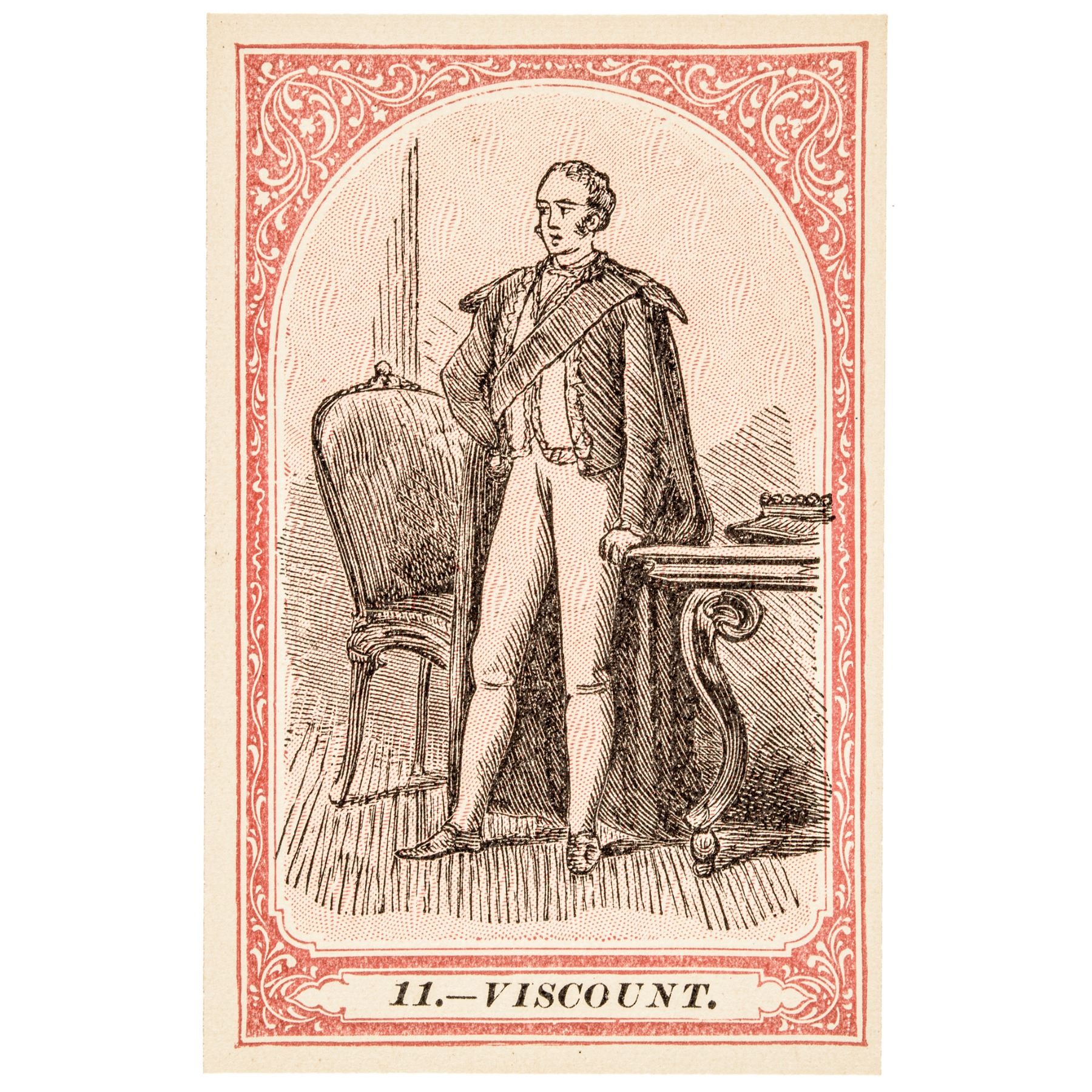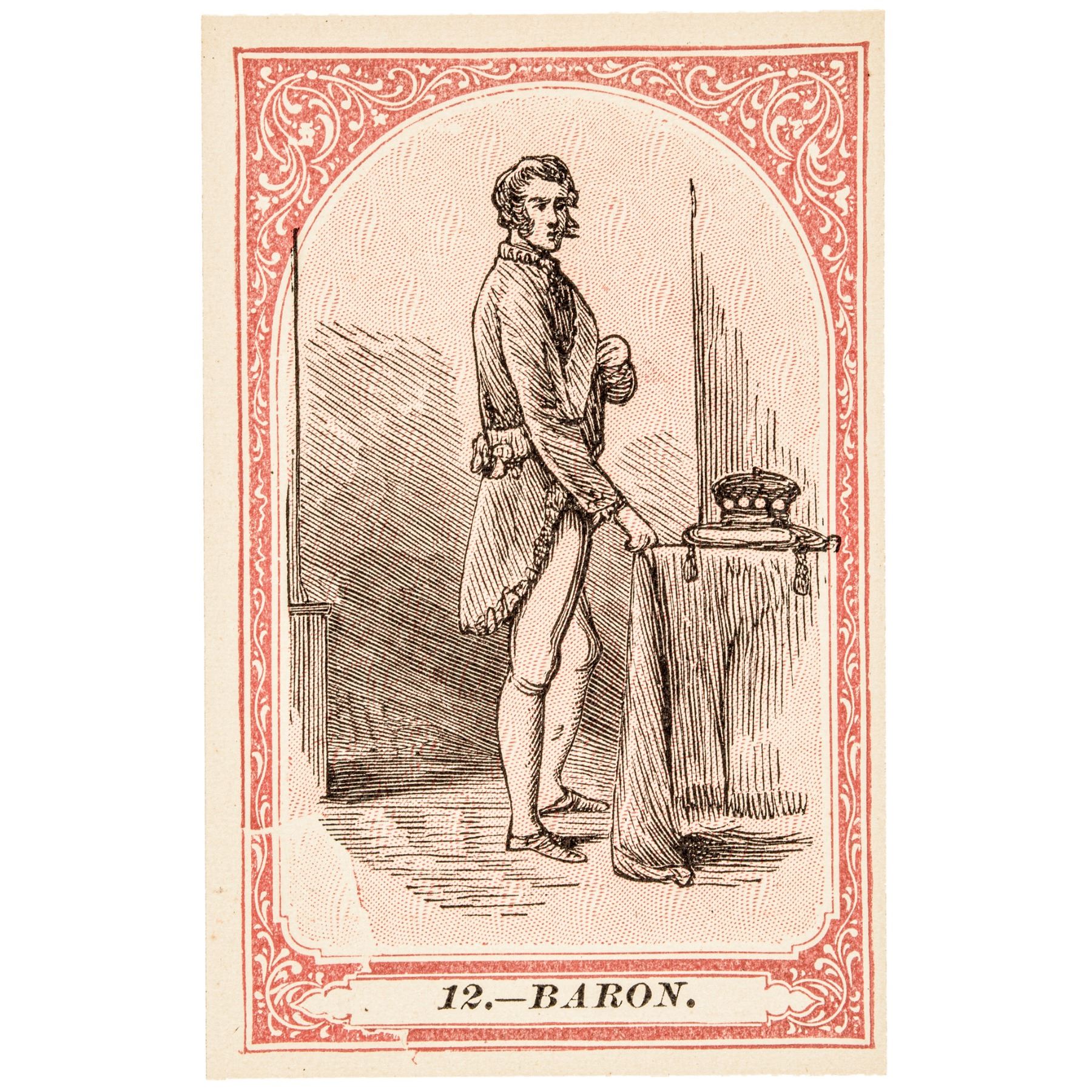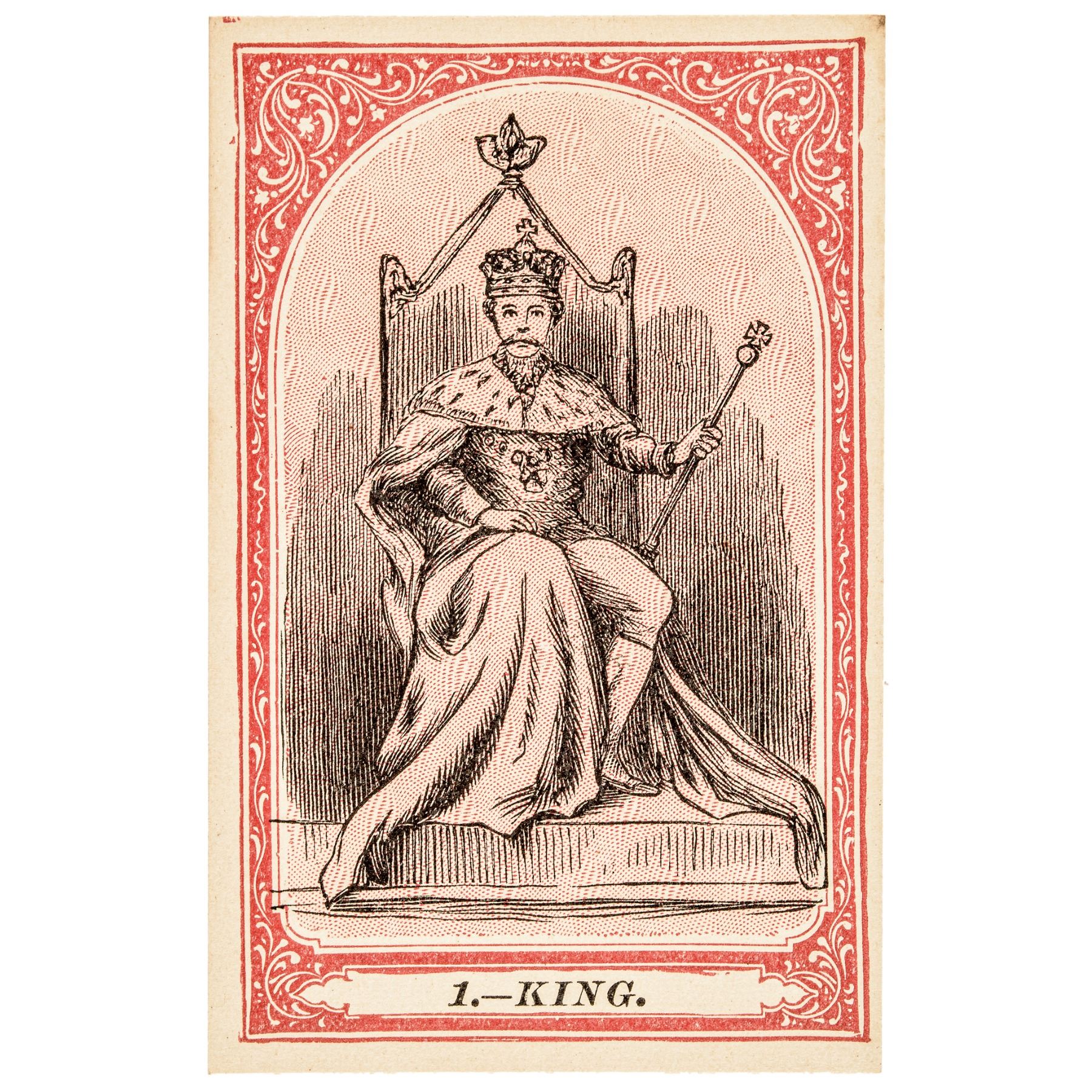 Very Rare Complete Game Deck of 56 Playing Cards including its Title card. The Title card reads: “Stevens Patent / Liberty. LAW. Protection. Habeas Corpus. / Patented Sep. 21, 1869.” There are four suits (silver, gold, red, and white) each having 14 imaged cards (1-King, 2-Queen, 3-Prince, 4-Princess, 5-Writ, 6-Sheriff, 7-Duke, 8-Duchess, 9-Marquis, 10-Earl, 11-Viscount, 12-Baron, 13-Baroness, 14-Little Tom). This highly Patriotic American designed backs are printed in brown displaying an American Heraldic Eagle with Shield. Overall quite excellent with no hint of wear on the cards. We previously sold a similar deck of 1869 Stevens Patent Playing Cards in our EAHA Auction of October 22, 2005, Lot 753 graded Near Mint with gilt edges, which brought $1,300. This Post Civil War Reconstruction Period political card game is Extremely Rare, especially in such excellent condition. The deck comes housed complete, still in its original paper wrapper which is slightly torn and somewhat soiled on the blank edge and back, not affecting the printed front.