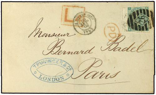1869 Envelope to FRANCE bearing 1/- green plate 4 (SG 117) tied by LONDON obliterator with oval PD and boxed L4 (Late Fee) with French entry cachet and PARIS arrival on reverse. Very scarce item paying the double letter rate and 4d Late Fee.