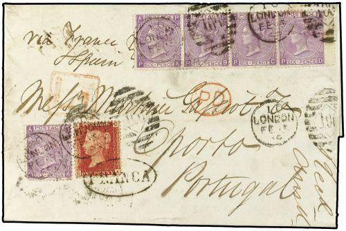 1869 Envelope to PORTUGAL bearing 1 d rose (SG 43) and 6 d mauve plate 6 (5) (SG 105) tied by LONDON duplex with handstruck boxed L1 routed via France with oval FRANCA and receiver on reverse. Attractive item.