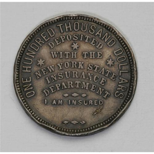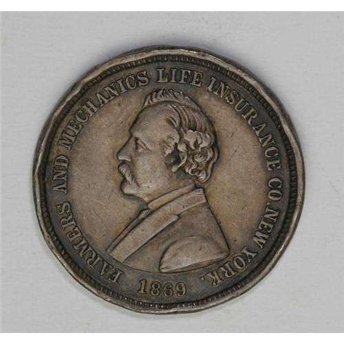 <B>Group Lot.</B></I> Includes: an 1869 Farmers' and Mechanics' Life Insurance Co. silver medallion, issued by the company as an advertising piece, listed on page 745 of Rulau's <I>Standard Catalog of U.S. Tokens 1700-1900</B></I> as NY-NY 70, the piece has been around and has numerous bumps and bangs; and a merchant's token issued by C.C. Cleaves, of Memphis, Tennessee, in 1852-56, listed on page 399 of Rulau and numbered Tenn 8a, AU, unpriced in the catalog above XF.