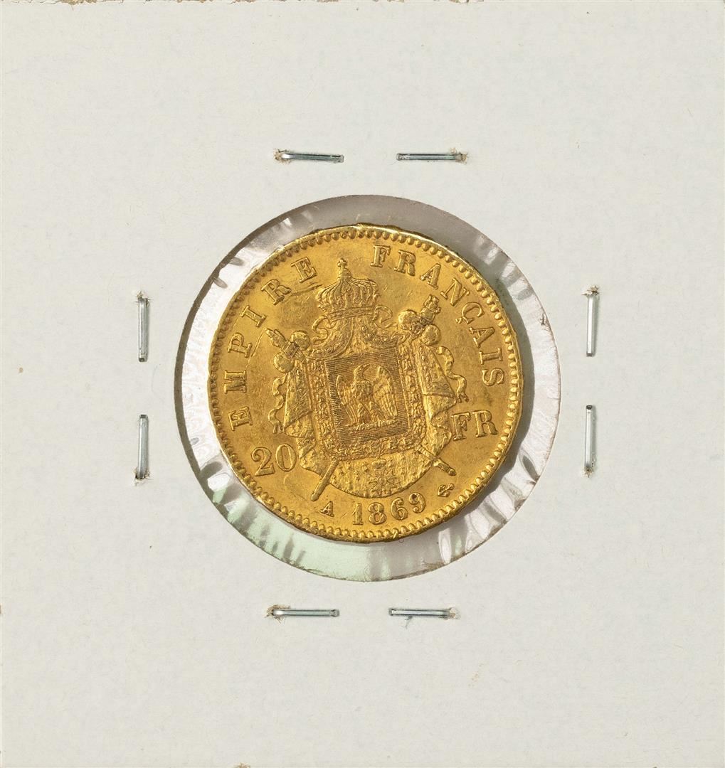 One 1869 France 20 Francs Napoleon III Gold Coin.