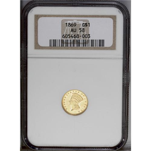 <B>1869<G$1> AU58 NGC.</B></I> Both sides have nearly complete, reflective luster, though the obverse has greater depth. Just a trace of friction is noted on the solidly struck honey-gold devices, and a cluster of marks appears inside the reverse wreath. Census: 13 in 58, 66 finer (9/06).<BR><I>From The Tide Collection.</B></I>