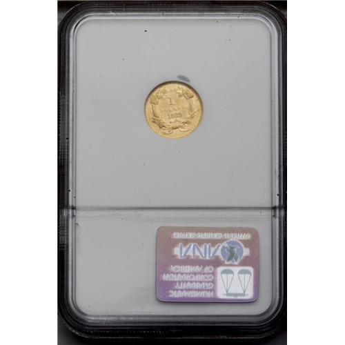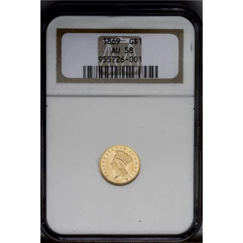 <B>1869<G$1> AU58 NGC.</B></I> Yellow-gold surfaces exhibit luster in the recessed areas, and the motifs are nicely defined; LIBERTY is strong. Wispy slide marks on each side do not distract.<BR><I>From The Steve Glenn Collection.</B></I> <BR><BR><B>Important notice:</B> Heritage usually auctions material at the rate of 200-250 lots per hour. On some occasions eBay Live bid software or the Internet may not be able to keep up with the pace of the auction. We recommend placing a realistic absentee bid now as insurance to avoid disappointment. Occasionally the auctioneer may eliminate or reject an eBay Live bid, and the auctioneer may also reopen a lot after the close of the eBay live bidding (usually because we missed an audience bid), and may reject your bid even if it shows you as the winning bidder. By bidding via eBay Live, you agree that Heritage may award the lot to another bidder at its sole discretion under the circumstances described above or any other reasonable circumstances. Since eBay bids are not shown to us until we open the lot on the floor, we treat those bids just like floor bids. In most cases the floor responds before the eBay bid is presented to us, due to Internet lag time, so for consistency we have made it a policy that floor bids are always considered first over tie eBay live bids. Also please note that all Heritage lots purchased through eBay Live carry a 20% Buyer's Premium. Please make sure you read the Terms and Conditions before you bid. This lot is being auctioned in conjunction with a live floor auction by Heritage Galleries & Auctioneers. All final auction and invoice information will be supplied by Heritage Galleries & Auctioneers, and all other information should be considered preliminary. Lot:2309 <BR><BR><B>Winning Notification and Billing:</B> After the FINAL session in this auction is complete, Heritage will send e-mail and snail mail invoices. This process normally takes several days. All final auction and invoice information will be supplied by Heritage Galleries & Auctioneers, and all other information should be considered preliminary. <BR><BR>This auction will be conducted on a live auction floor and over the Internet through eBay Live. If you choose to place an absentee bid, please take a moment to <font color='#0000ff'><u><a href='http://pages.ebay.com/liveauctions/help/before/laabsentee.html'>learn how eBay Live absentee bidding works</a></u></font><font color='#000000'>