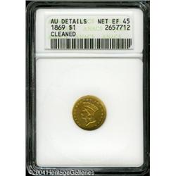 1869 G$1 --Cleaned--ANACS. AU Details, Net XF45. No <B>1869 G$1 --Cleaned--ANACS. AU Details, Net XF45.</B></I> Noticeably hairlined from a rather harsh cleaning. Still, this is a very scarce date with only 5,900 business strikes being minted. Worth a close look. <BR><BR><B>Important notice:</B> Heritage usually auctions material at the rate of 200-250 lots per hour. On some occasions eBay Live bid software or the Internet may not be able to keep up with the pace of the auction. We recommend placing a realistic absentee bid now as insurance to avoid disappointment. Occasionally the auctioneer may eliminate or reject an eBay Live bid, and the auctioneer may also reopen a lot after the close of the eBay live bidding (usually because we missed an audience bid), and may reject your bid even if it shows you as the winning bidder. By bidding via eBay Live, you agree that Heritage may award the lot to another bidder at its sole discretion under the circumstances described above or any other reasonable circumstances. Since eBay bids are not shown to us until we open the lot on the floor, we treat those bids just like floor bids. In most cases the floor responds before the eBay bid is presented to us, due to Internet lag time, so for consistency we have made it a policy that floor bids are always considered first over tie eBay live bids. Also please note that all Heritage lots purchased through eBay Live carry a 20% Buyer's Premium. Please make sure you read the Terms and Conditions before you bid. This lot is being auctioned in conjunction with a live floor auction by Heritage Galleries & Auctioneers. All final auction and invoice information will be supplied by Heritage Galleries & Auctioneers, and all other information should be considered preliminary. Lot:6467