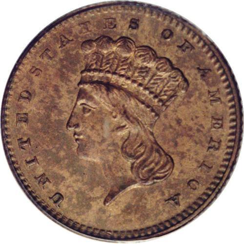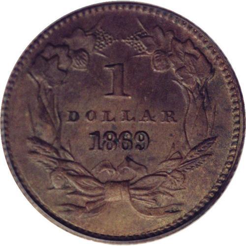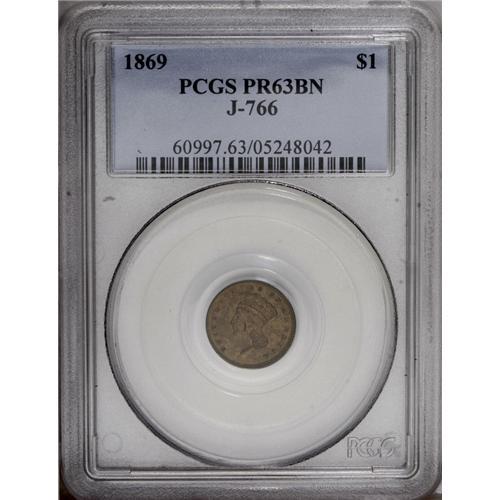 <B>1869<G$1> Gold Dollar, Judd-766, Pollock-851, High R.7, PR63 Brown PCGS.</B></I> Struck from regular issue dies in copper with a reeded edge. This dies trial piece was presumably originally offered as part of a complete copper denomination set of 1869 coinage. The strike is precise, with only trivial incompleteness noted on the upper left portion of Liberty's crown. The obverse is generally light brown with a few dashes of medium brown. The reverse has slightly deeper and more consistent saddle-brown toning. Unmarked and attractive.