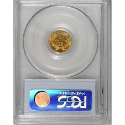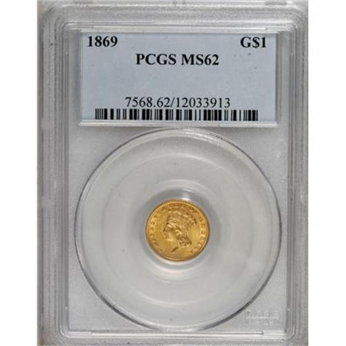 <B>1869 G$1 MS62 PCGS.</B></I> An enticing canary-gold example of this postwar gold dollar issue, solidly struck with stronger eye appeal than the grade might suggest. One of just 5,900 business strikes issued. Population: 13 in 62, 38 finer (10/07).<BR><BR><B>Coin Engraver:</B> James B. Longacre<BR><BR><b>Shipping:</b> Coins & Currency (<a target="_blank" href="http://www.heritageauctions.com/common/shipping.php">view shipping information</a>)