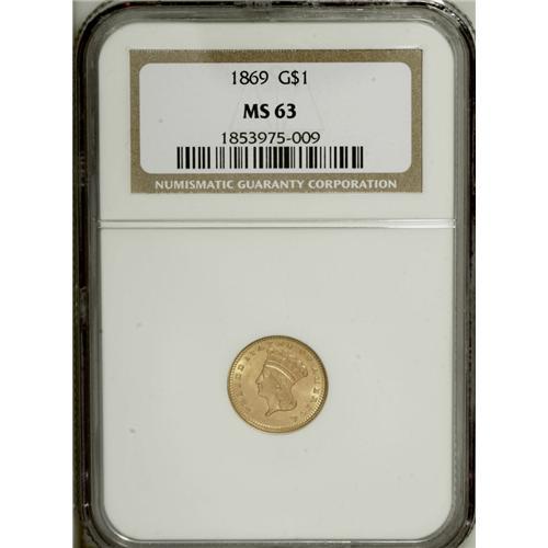 1869 G$1 MS63 NGC. The 5,900-piece business strike 186