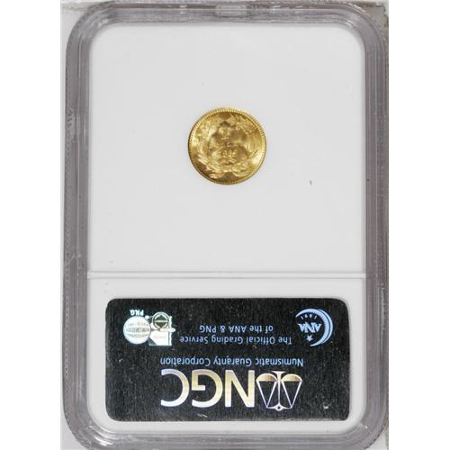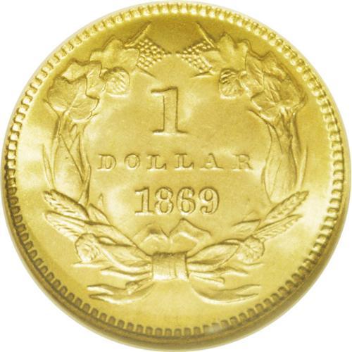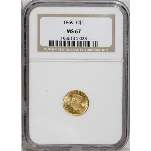 <B>1869<G$1> MS67 NGC.</B></I> The original mintage of 5,925 pieces has survivors mostly in AU and the lower Mint State grades. This date is elusive in Gem grades, and at the Superb Gem level this issue is very rare and difficult to acquire. The present example has slightly frosty and excellent luster and yellow-gold surfaces with hints of pale green. Akers notes that this issue "...is the most consistently well-manufactured Gold Dollar of the 1860's although it is often encountered with weak reverse centers." The diagnostic softness on the R of DOLLAR is the only trace of striking weakness on this magnificent and appealing coin. Census: 3 in 67, 3 finer (7/06).<BR><I>From The Derrick Snider Collection.</B></I>