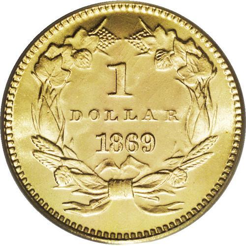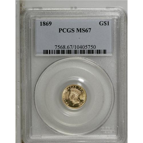 <B>1869 G$1 MS67 PCGS.</B></I> The 1869 had a business strike mintage of 5,900 pieces, and is generally available in AU and in the lower Uncirculated grades. Higher Mint State grades are considerably more challenging, especially in Premium Gem and above. Fewer than 15 examples have been certified in MS67 (the grade of the coin in the current lot) by PCGS and NGC combined, and only five specimens finer.<BR> This piece jumps out at the viewer, displaying as it does beautiful brass-gold surfaces that radiate vibrant luster and sharply delineated design elements. Close examination reveals no mentionable flaws on this truly breath-taking superb example. As is typical of business strikes, this specimen exhibits extra outlines on the obverse peripheral letters, a "teardrop" chip below the right corner of the eye, and a die file mark through the ear.<BR><BR><b>Shipping:</b> Coin/Currency (<a target="_blank" href="http://www.heritageauctions.com/common/shipping.php">view shipping information</a>)
