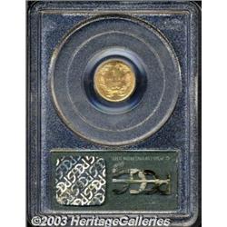 1869 G$1 MS67 PCGS. This is a stellar example of an 1869 Gold Dollar. A typically well produced piece, neither side reveals any mentionable striking incompleteness. Virtually all clashmarks and striations, which are often seen on business strikes from this era, are conspicuously absent on both sides. The silky-smooth "skin" is undisturbed by handling marks, a feature that allows full appreciation of the reddish-gold color combining with swirling cartwheel frost. Suggestions of powder-blue patination are seen here and there for additional eye appeal. Essentially unsurpassable in grade, to date (10/03), PCGS has seen 9 examples in MS67 with only 2 finer. Important notice: Heritage usually auctions material at the rate of 200-250 lots per hour. On some occasions eBay Live bid software or the Internet may not be able to keep up with the pace of the auction. We recommend placing a realistic absentee bid now as insurance to avoid disappointment. Occasionally the auctioneer may eliminate or reject an eBay Live bid, and the auctioneer may also reopen a lot after the close of the eBay live bidding (usually because we missed an audience bid), and may reject your bid even if it shows you as the winning bidder. By bidding via eBay Live, you agree that Heritage may award the lot to another bidder at its sole discretion under the circumstances described above or any other reasonable circumstances. Also please note that all Heritage lots purchased through eBay Live carry a 20% Buyer's Premium. Please make sure you read the Terms and Conditions before you bid.