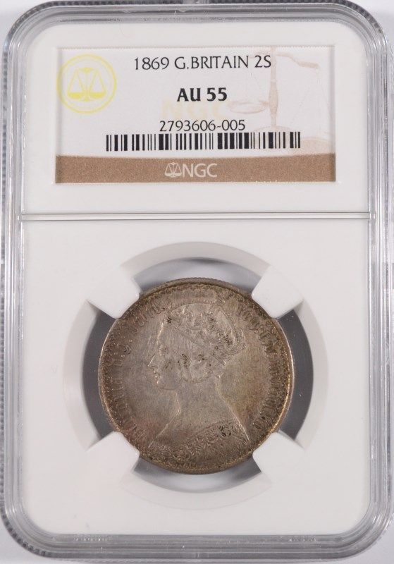 1869 GREAT BRITAIN FLORIN 2-SHILLINGS, NGC AU-55 SCARCE!