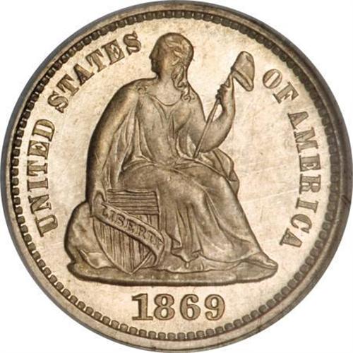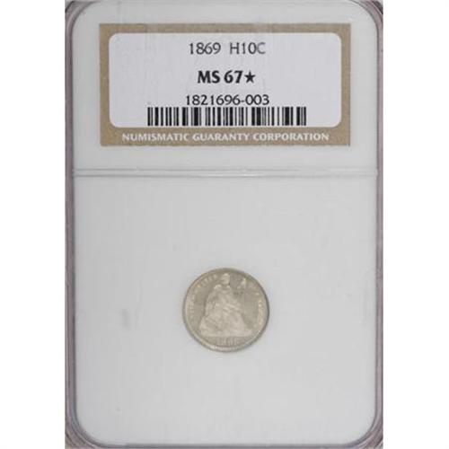 <B>1869 H10C MS67 <img src="/images/star.gif" width="10" height="10" alt="" border="0"> NGC.</B></I> Gently toned in apricot hues, this well struck and moderately prooflike half dime is nearly immaculate, except for several tiny ticks near 9 o'clock on the reverse. A better issue in Mint State, the mintage of 208,000 pieces is low when compared with the multi-million piece productions in 1861 and 1872. NGC Census: 1 in 67 <B><img src="/images/star.gif" width="10" height="10" alt="" border="0"></B></I>, 1 finer as MS68 without a star designation (12/07).<BR><BR><B>Coin Engraver:</B> Christian Gobrecht<BR><BR><b>Shipping:</b> Coins & Currency (<a target="_blank" href="http://www.heritageauctions.com/common/shipping.php">view shipping information</a>)