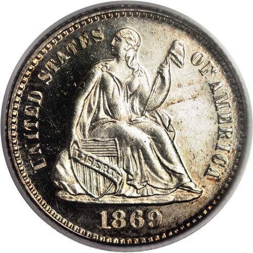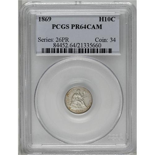 <B>1869<H10C> PR64 Cameo PCGS.</B></I> A sharply struck near-Gem proof with bright silver surfaces and light cameo contrast. The obverse features a touch of peripheral russet-red toning.