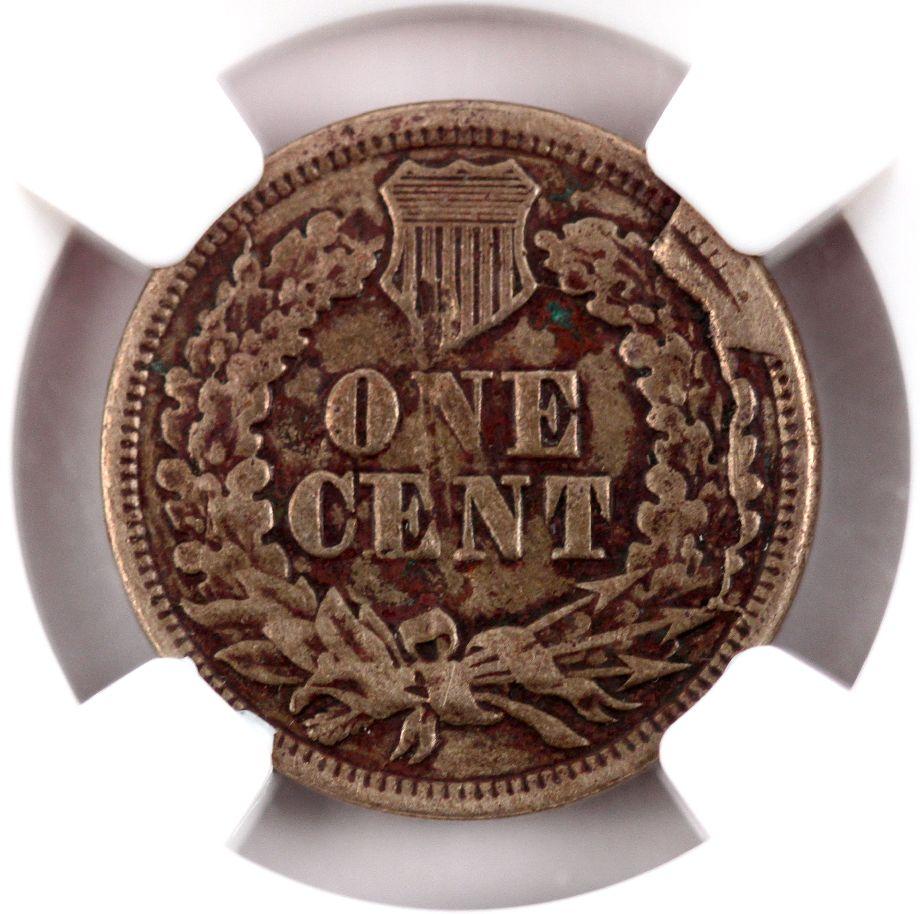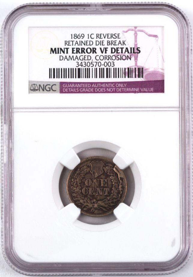 NGC encapsulated Mint error Retained Die Break VF details, damaged corrosion, 1869 better date error.