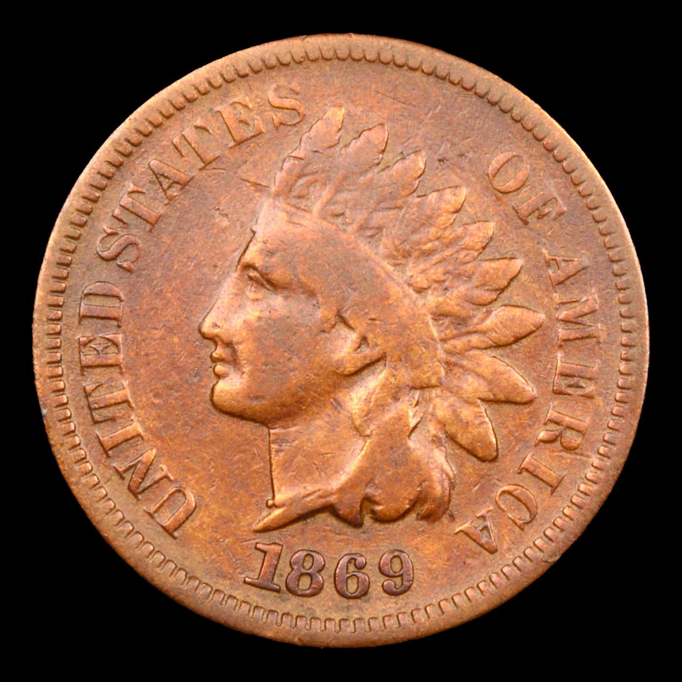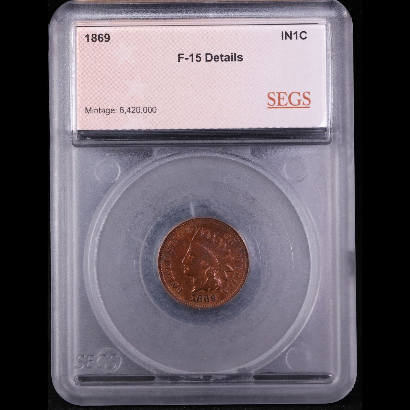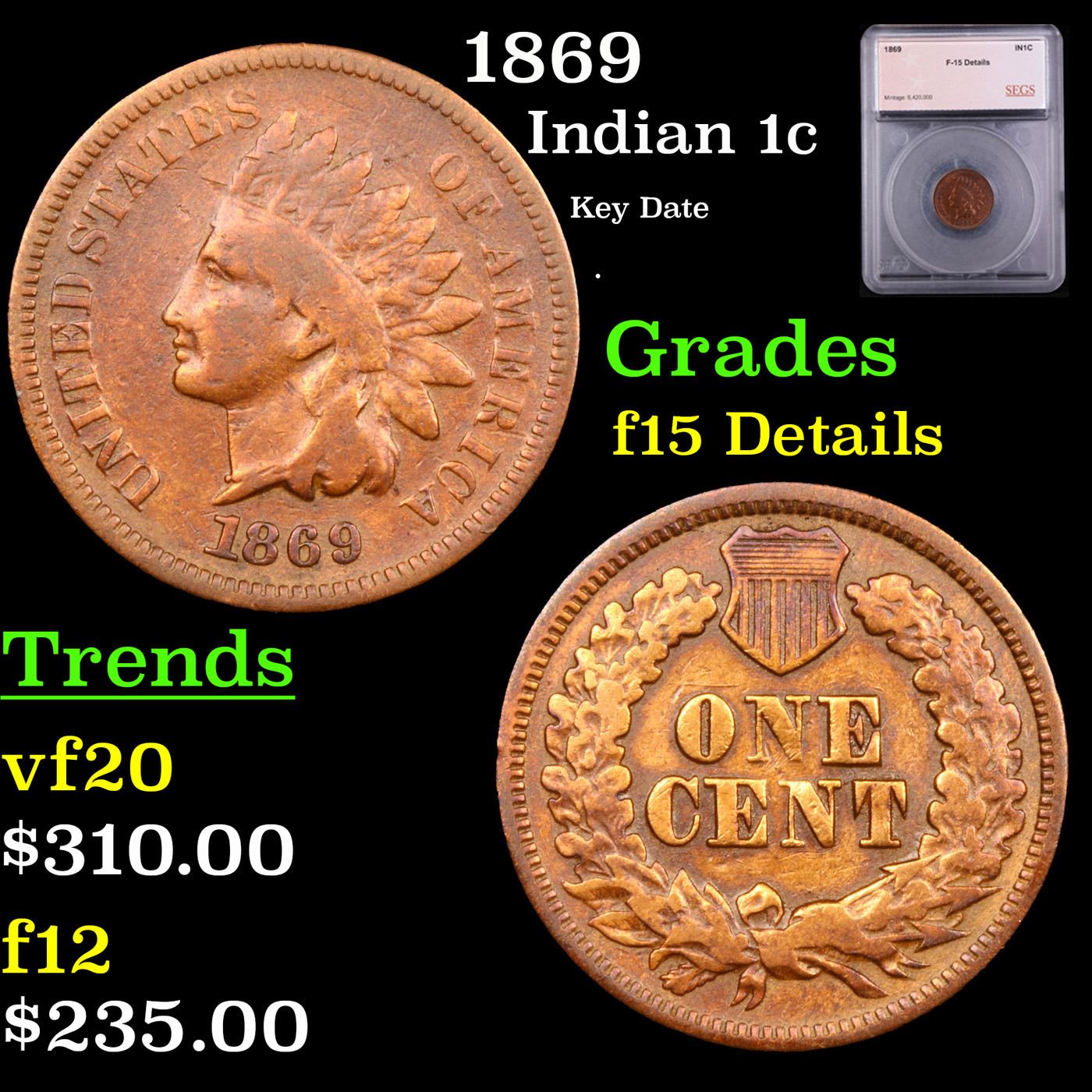 1869 Indian Cent 1c Graded f15 BY SEGS. Quoting from PCGS "The 1869 is one of the rarest Indian cents in all grades. The 1869 is considered one of the key dates of the series and is worth a premium price even in the lowest grades."