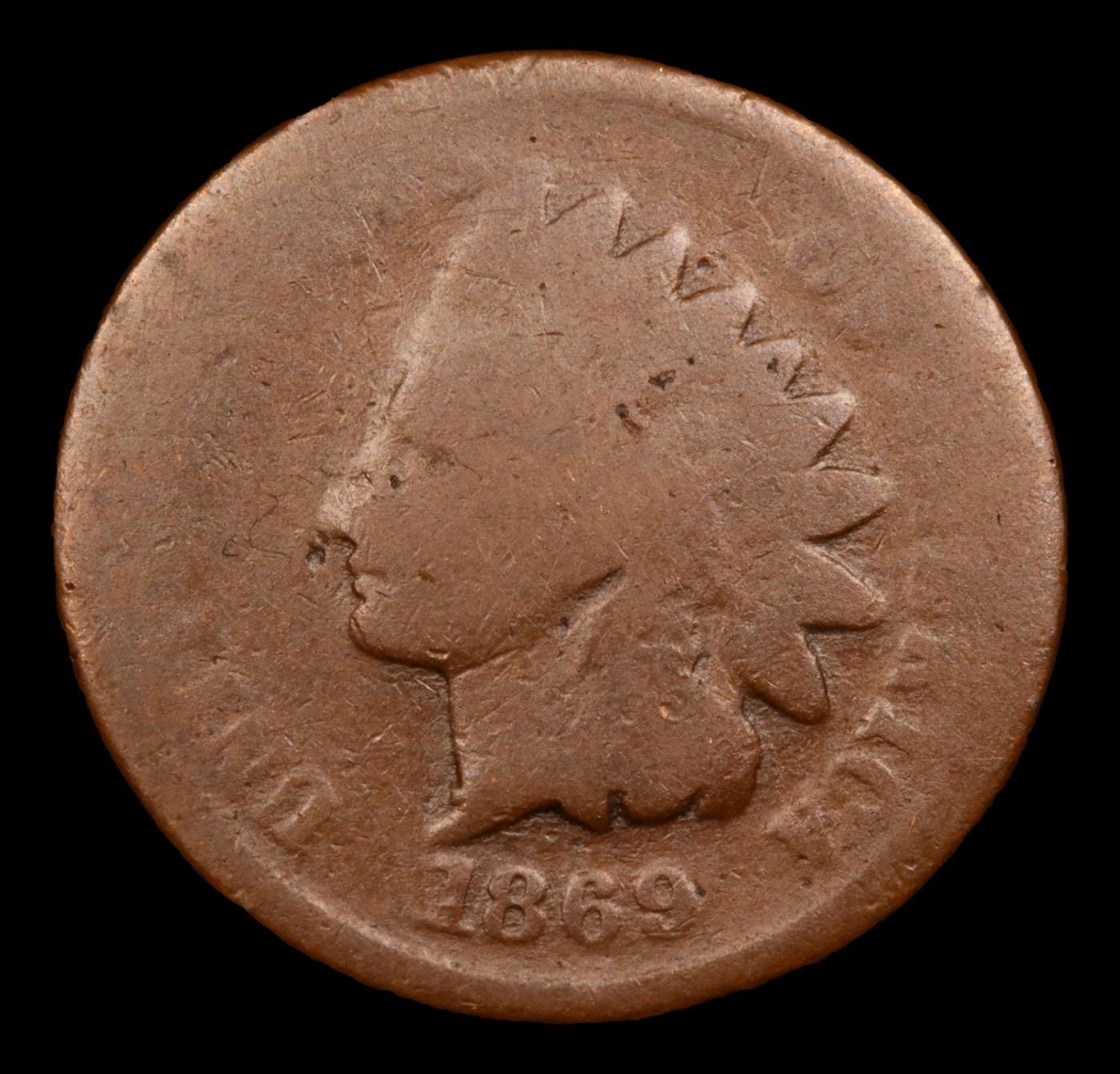 1869 Indian Cent 1c Grades g+. Quoting from PCGS "The 1869 is one of the rarest Indian cents in all grades. The 1869 is considered one of the key dates of the series and is worth a premium price even in the lowest grades."