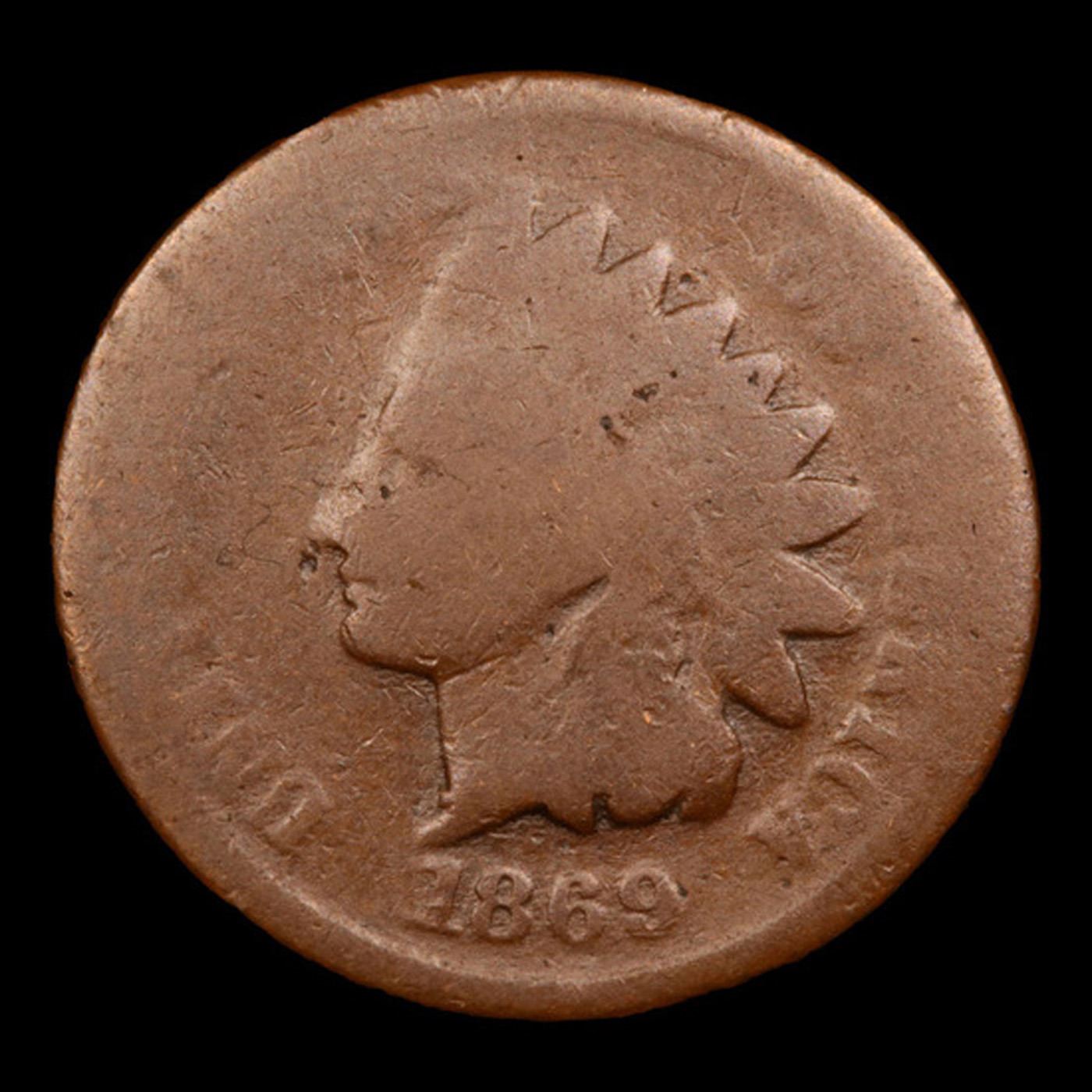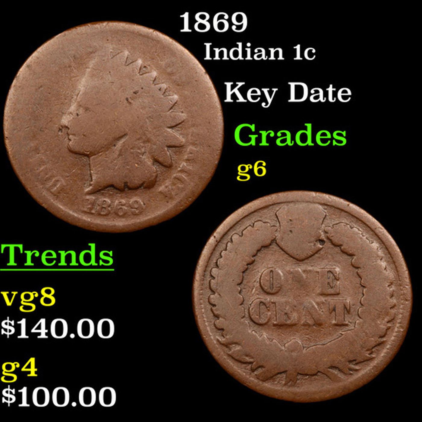 1869 Indian Cent 1c Grades g+. Quoting from PCGS "The 1869 is one of the rarest Indian cents in all grades. The 1869 is considered one of the key dates of the series and is worth a premium price even in the lowest grades."
