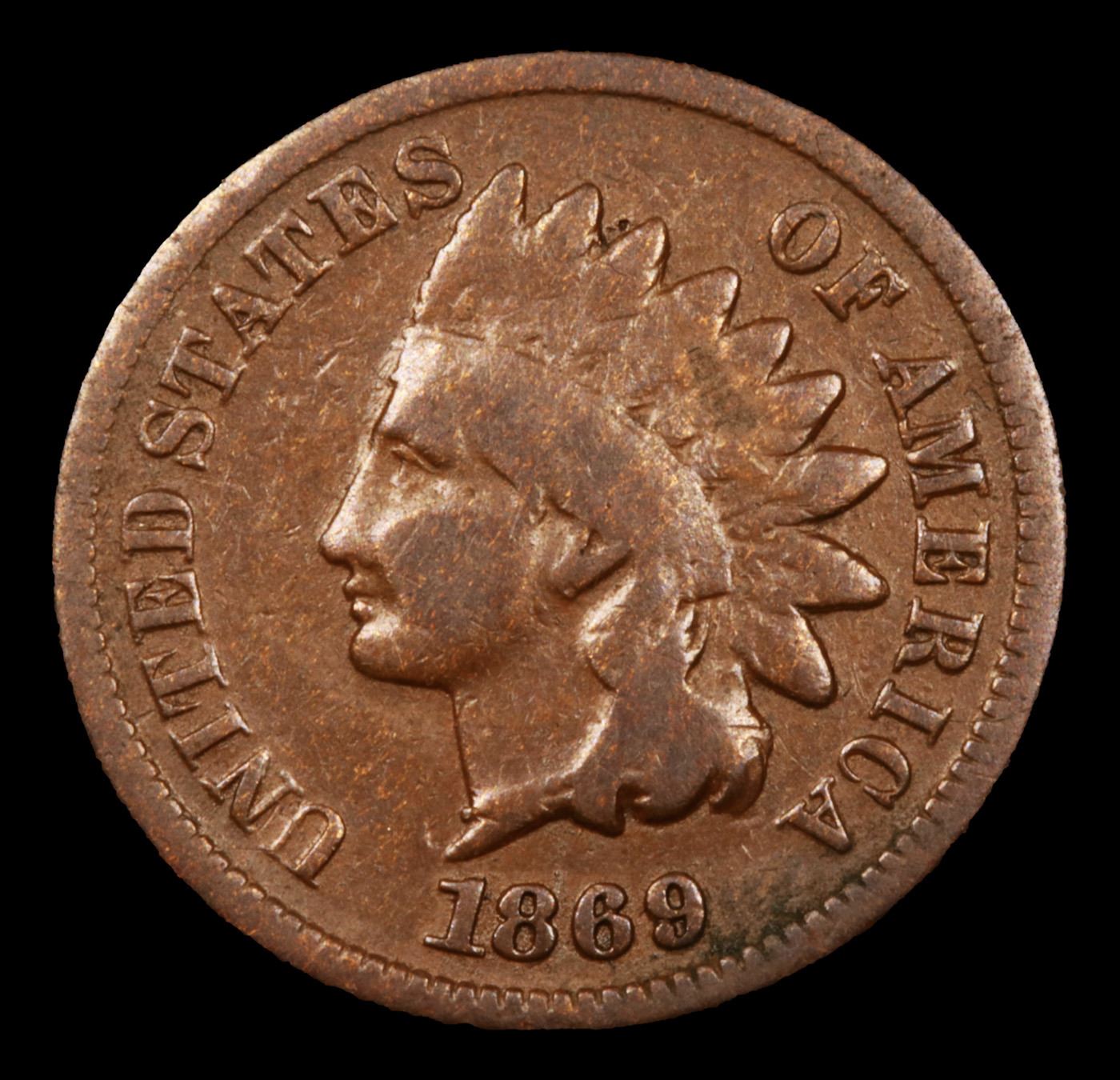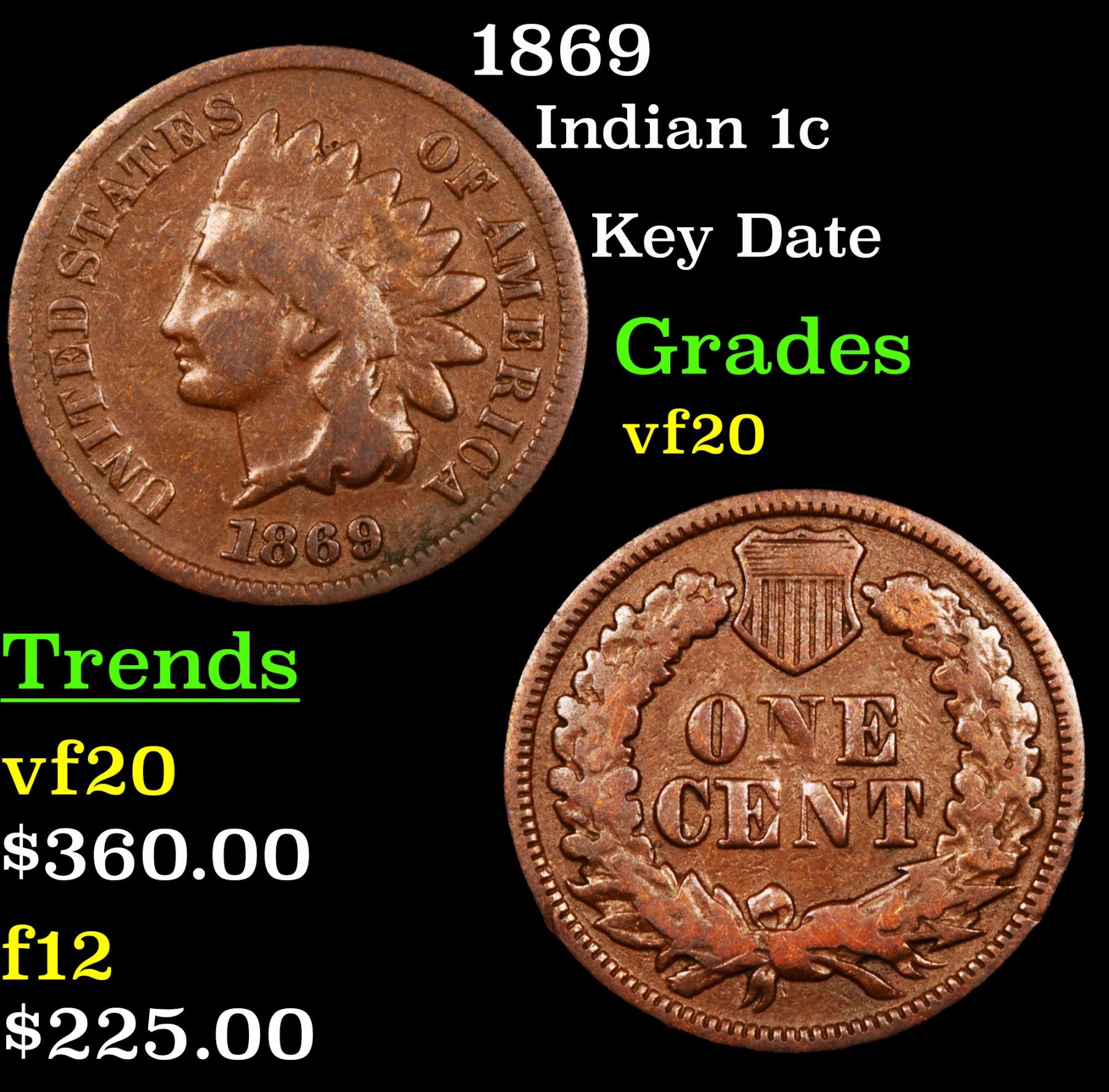 1869 Indian Cent 1c Grades vf, very fine. Quoting from PCGS "The 1869 is one of the rarest Indian cents in all grades. The 1869 is considered one of the key dates of the series and is worth a premium price even in the lowest grades."