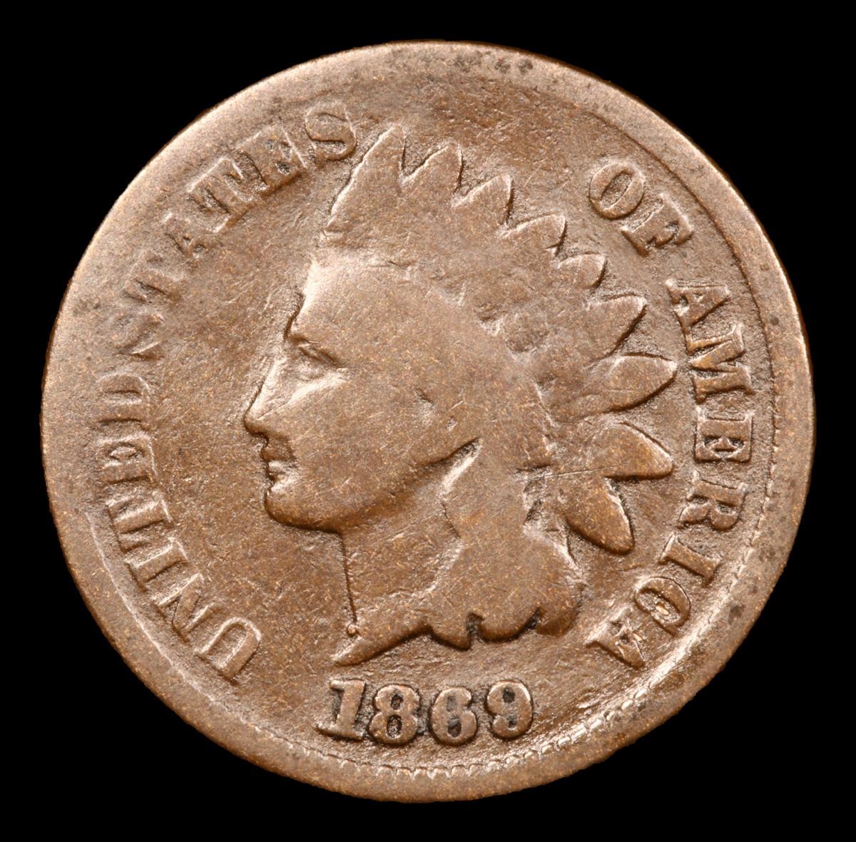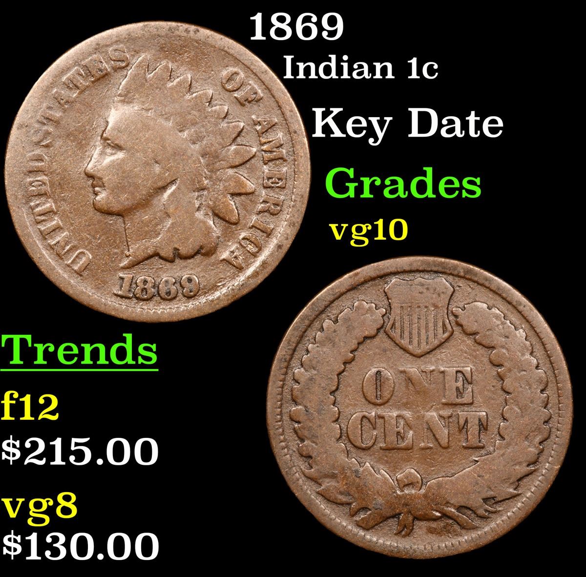 1869 Key Date . Indian Cent 1c Grades vg+. Quoting from PCGS "The 1869 is one of the rarest Indian cents in all grades. The 1869 is considered one of the key dates of the series and is worth a premium price even in the lowest grades."
