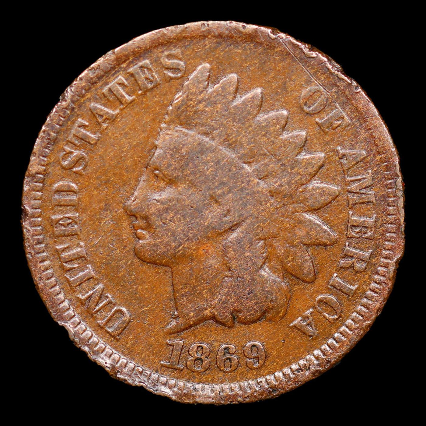1869 Indian Cent 1c Grades vg+. Quoting from PCGS "The 1869 is one of the rarest Indian cents in all grades. The 1869 is considered one of the key dates of the series and is worth a premium price even in the lowest grades."