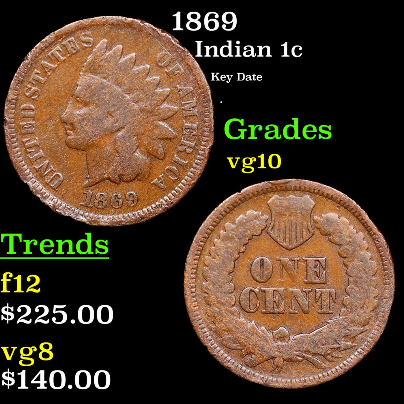 1869 Indian Cent 1c Grades vg+. Quoting from PCGS "The 1869 is one of the rarest Indian cents in all grades. The 1869 is considered one of the key dates of the series and is worth a premium price even in the lowest grades."