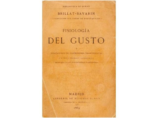 1869. LIBRO: (GASTRONOMIA). BRILLAT-SAVARIN, JEAN-ANTHELME: FISIOLOGÍA DEL GUSTO O MEDITACIONES DE GASTRONOMÍA TRASCENDENTAL. Madrid: Alfonso Duran, 1869. 8º. 3 hojas, 368 p. Rústica edit., lomo quebradizo. Dedicatoria manuscrita de anterior poseedor. Primera edición en lengua castellana. Traducción del conde de Rodalquilar. Rara.