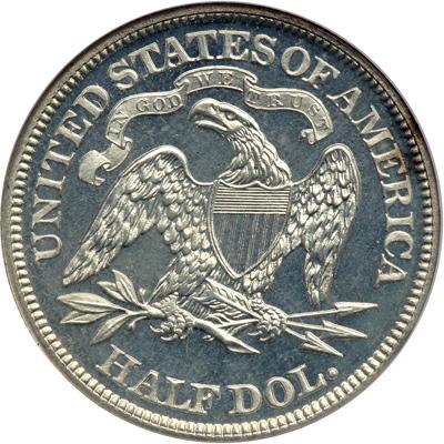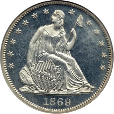 1869 Liberty Seated Half Dollar. NGC graded Proof 65. A totally white example. Only 600 Proofs made. This fully struck Gem has glowing icy white frost on the devices and no problems to mention on either side. Very elusive in Gem Proof condition and with intact mirror surface. Having covered the mint bloom, we take stock of the coin's detail. Clockwork precision seen in the main devices as well as the stars, legends, and the date. Razor-sharp detail on both sides. Pop 15; 15 finer.