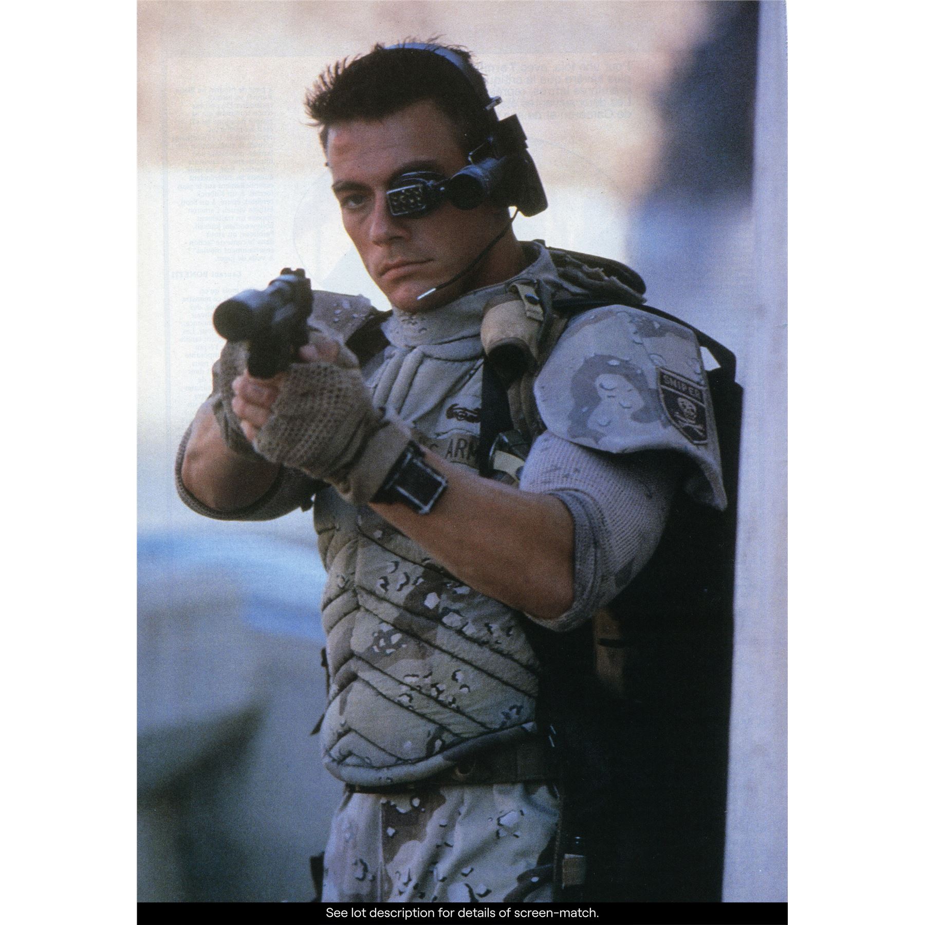 UNIVERSAL SOLDIER (1992) - Luc Deveraux's (Jean-Claude Van Damme) Screen-Matched "G44" UniSol Vest with Pauldron and Belt - Luc Deveraux's (Jean-Claude Van Damme) screen-matched "G44" UniSol vest with a pauldron and belt from Roland Emmerich's Universal Soldier. Deveraux wore his signature vest, belt, and in some cases pauldrons as part of his military uniform while fighting as G44 in the UniSol program. Distinctive camouflage patterns and staining on the vest in this lot screen-matches to the hostage rescue mission at the Hoover Dam.