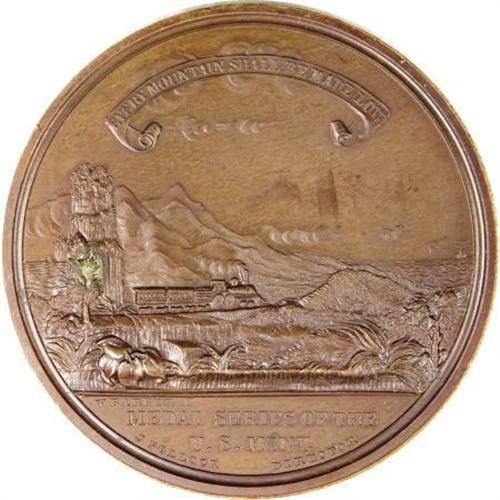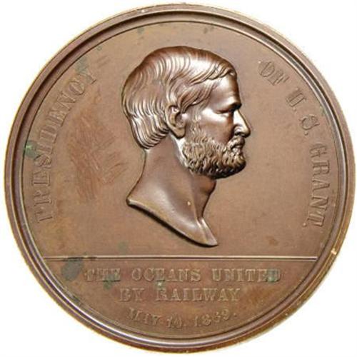 <B>1869 Pacific Railroad Completion, HK-12, Near-Mint State.</B></I> HK-12, Julian-CM-39. Bronzed copper, 45.3 mm, 49.9 gm. Engraved by William Barber. Obverse bust right, PRESIDENCY OF U.S. GRANT around, THE OCEANS UNITED BY RAILWAY / MAY 10, 1869 in exergue beneath. Reverse EVERY MOUNTAIN SHALL BE MADE LOW on scroll above, mountain-railroad scene in center with train heading eastward, W BARBER F beneath in small letters, MEDAL SERIES OF THE U.S. MINT. In small letters beneath, J POLLOCK DIRECTOR. This item will interest both so-called dollar collectors and collectors of U.S. Mint medals, since it is obviously both. The chocolate-brown piece has full mint luster, but a few corrosion/carbon specks are noted on the obverse, along with a larger, good-sized patch on the reverse at the pine tree. The tall extrusion of mountainous rock behind greatly resembles Devils Tower in Wyoming, of <I>Close Encounters of the Third Kind</B></I> fame. Uncertified, but with an NGC tag stating "Corrosion" and providing the Julian and Hibler-Kappen attributions.<BR><BR><b>Shipping:</b> Coins & Currency (<a target="_blank" href="http://www.heritageauctions.com/common/shipping.php">view shipping information</a>)
