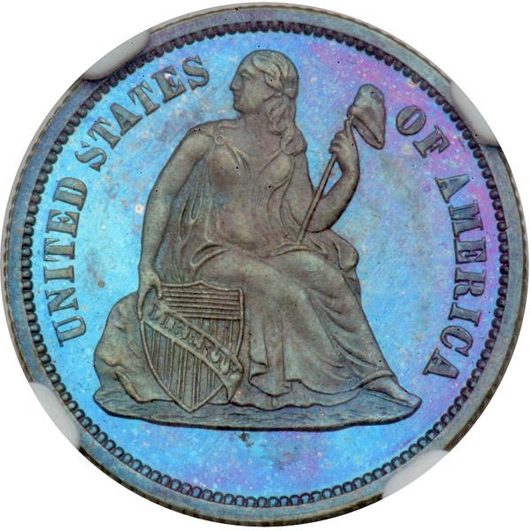1869 Pattern Dime. Copper, reeded edge. NGC graded Proof 65 Red & Brown. Wonderful blue and lilac iridescent toning. A glistening beauty and a gem by any standards. An engaging display of lively mirror reflectivity leaps across the surface on both sides of this rare Pattern Dime. The strike is sharp as a knife for the date, with just outstanding detail in Liberty's head, gown, and shield, with similar strong detail in the lettering on the reverse. Pop 1; the only example in RB graded at NGC.