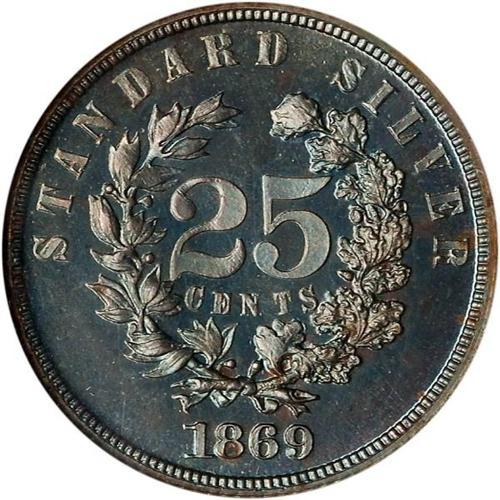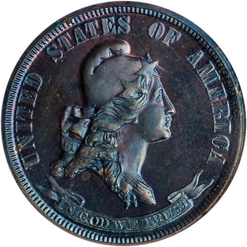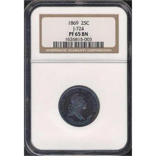 <b>1869 Pattern Quarter Dollar. Copper, reeded edge. Judd-724. Pollock-805. NGC graded PF65 BR.</b> The deep brown luster on both sides is full with a dazzling electric blue mirror sparkle (the devices are satin frosted). What is also clearly evident is that the coin possesses well-struck devices with good details. It has no bothersome abrasions or points of wear, either, further confirming its gem status <b>(PCGS # 60951)</b>