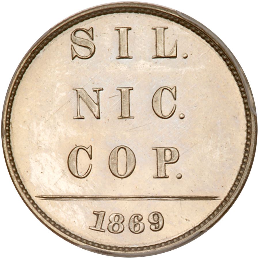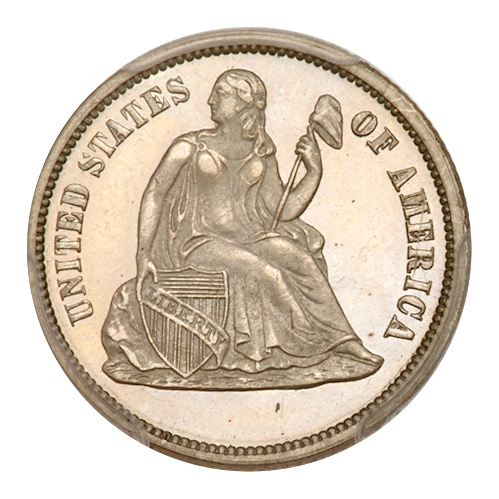 1869 Pattern Dime. Nickel alloy, reeded edge. Judd-717a. Pollock-798. High Rarity 7. PCGS graded Proof 65 Cameo. CAC. PQ. The obverse shows the regular dies of the dime, but without the date below, just a blank area while the reverse is a very simple die with SIL. / NIC. / COP. / heavy line and 1869 below the line. This one was struck in nickel alloy to test the dies, with outstanding surfaces and eye appeal for this prized rarity. Only a few are known and this is certainly one of the finest. Amazing eye appeal, color and Cameo contrast. Should grade a point higher or more. Slabbed with a limited PCGS Generation 2.0 Label. Pop 1; 1 finer in 65+ for Proof Cameo. Estimated Value 8,000 - UP
