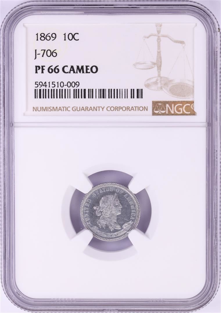 One 1869 Proof Pattern Dime Coin NGC PF66 Cameo Judd-706 Rarity-7. NGC Certified.