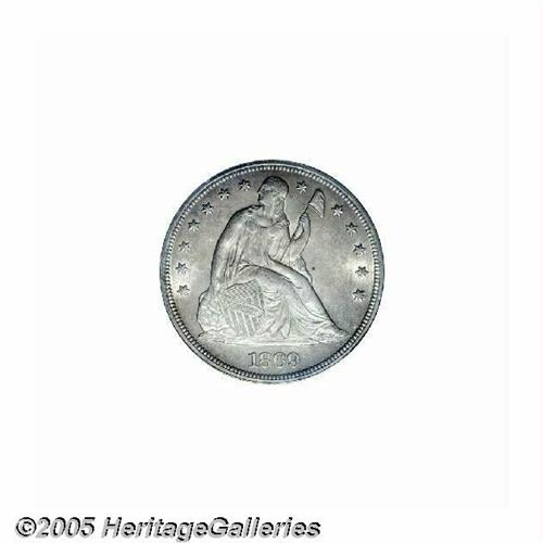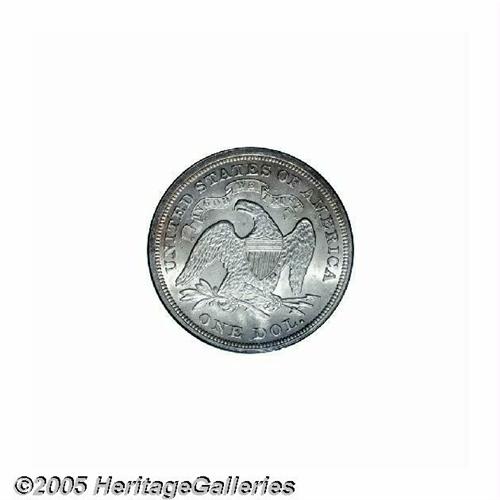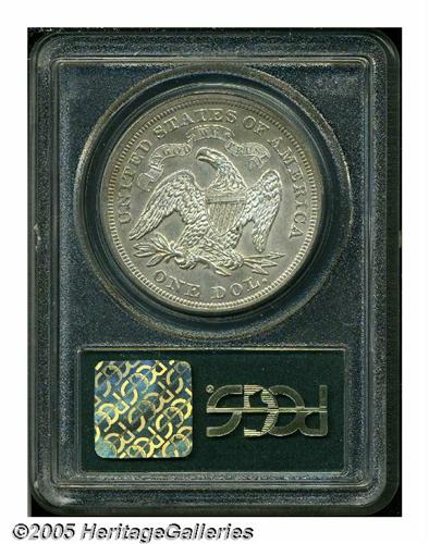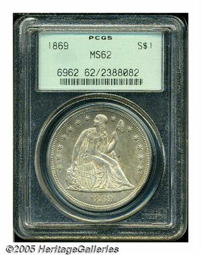 <B>1869<S$1> MS62 PCGS.</B></I> 1869 dollars are rare despite their relatively high mintage of 423,700 business strikes. The large coinage was apparently undertaken to provide coins for export to the Far East to fill the void left when the Mexican peso fell out of favor with Chinese merchants. This coin displays a thin layer of warm golden-brown patina overlying lustrous surfaces. The design features are well executed, illustrating just a touch of the usual weakness at the top of the eagle's right wing. A few grade-defining contact marks are noted on Liberty's motif and on the reverse shield. Very pleasing overall eye appeal for the grade. Population: 9 in 62, 24 finer (6/05).<BR><I>From The Dr. John L. Pellegrini Collection of Liberty Seated Dollars.</B></I>