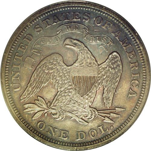 <B>1869<img border='0' src='http://www.heritagecoins.com/images/star.gif' width=10 height=10>$1> MS63 PCGS.</B></I> This is an impressive example that is very scarce in any Mint State grade. Deeply toned with lilac, sea-green, and steel-blue color over both sides. The mintage of this issue was rather large, but many or most were exported to the orient and elsewhere, thus leaving few in this country for collectors to hold and preserve. Both sides of this example are modestly abraded, as expected. Population: 17 in 63, 9 finer (3/06). <BR><BR><B>Important notice:</B> Heritage usually auctions material at the rate of 200-250 lots per hour. On some occasions eBay Live bid software or the Internet may not be able to keep up with the pace of the auction. We recommend placing a realistic absentee bid now as insurance to avoid disappointment. Occasionally the auctioneer may eliminate or reject an eBay Live bid, and the auctioneer may also reopen a lot after the close of the eBay live bidding (usually because we missed an audience bid), and may reject your bid even if it shows you as the winning bidder. By bidding via eBay Live, you agree that Heritage may award the lot to another bidder at its sole discretion under the circumstances described above or any other reasonable circumstances. Since eBay bids are not shown to us until we open the lot on the floor, we treat those bids just like floor bids. In most cases the floor responds before the eBay bid is presented to us, due to Internet lag time, so for consistency we have made it a policy that floor bids are always considered first over tie eBay live bids. Also please note that all Heritage lots purchased through eBay Live carry a 20% Buyer's Premium. Please make sure you read the Terms and Conditions before you bid. This lot is being auctioned in conjunction with a live floor auction by Heritage Galleries & Auctioneers. All final auction and invoice information will be supplied by Heritage Galleries & Auctioneers, and all other information should be considered preliminary. Lot:2191 <BR><BR><B>Winning Notification and Billing:</B> After the FINAL session in this auction is complete, Heritage will send e-mail and snail mail invoices. This process normally takes several days. All final auction and invoice information will be supplied by Heritage Galleries & Auctioneers, and all other information should be considered preliminary. <BR><BR>This auction will be conducted on a live auction floor and over the Internet through eBay Live. If you choose to place an absentee bid, please take a moment to <font color='#0000ff'><u><a href='http://pages.ebay.com/liveauctions/help/before/laabsentee.html'>learn how eBay Live absentee bidding works</a></u></font><font color='#000000'>