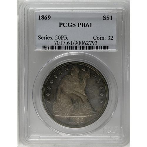 1869 S$1 PR61 PCGS. Blue and russet surfaces, with a p