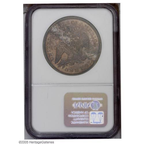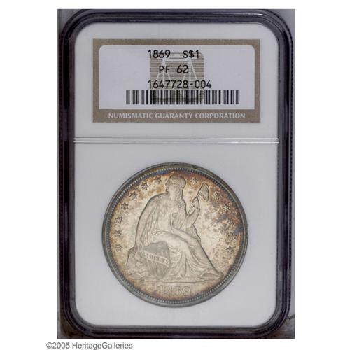 <B>1869<S$1> PR62 NGC.</B></I> A rich layer of mottled toning covers each side of this well struck proof. The reverse shows deep violet-purple color, while the obverse has golden-brown patina near the borders, and light golden-gray toning over the central device. Both sides seem free of contact marks.