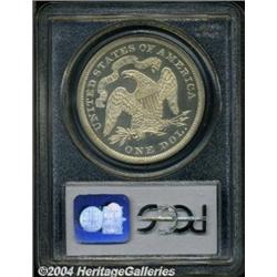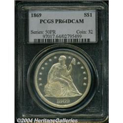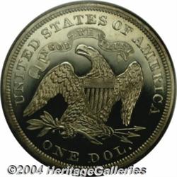 <B>1869<S$1> PR64 Deep Cameo PCGS.</B></I> This well struck specimen possesses gold-tinged devices and gently mirrored fields. The reverse is beautifully preserved, while a few trivial hairlines accompany the obverse field. The base of the 1 in the date is recut, and the dies are moderately rotated counterclockwise. Only 600 proofs were struck, and PCGS has only certified ten examples in all grades as Deep Cameo. Population: 3 in 64 Deep Cameo, 5 finer (3/04). <BR><BR><B>Important notice:</B> Heritage usually auctions material at the rate of 200-250 lots per hour. On some occasions eBay Live bid software or the Internet may not be able to keep up with the pace of the auction. We recommend placing a realistic absentee bid now as insurance to avoid disappointment. Occasionally the auctioneer may eliminate or reject an eBay Live bid, and the auctioneer may also reopen a lot after the close of the eBay live bidding (usually because we missed an audience bid), and may reject your bid even if it shows you as the winning bidder. By bidding via eBay Live, you agree that Heritage may award the lot to another bidder at its sole discretion under the circumstances described above or any other reasonable circumstances. Since eBay bids are not shown to us until we open the lot on the floor, we treat those bids just like floor bids. In most cases the floor responds before the eBay bid is presented to us, due to Internet lag time, so for consistency we have made it a policy that floor bids are always considered first over tie eBay live bids. Also please note that all Heritage lots purchased through eBay Live carry a 20% Buyer's Premium. Please make sure you read the Terms and Conditions before you bid. </span></font></tr></table></td></tr></table>