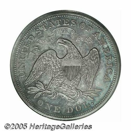 <B>1869<S$1> PR64 PCGS.</B></I> Like the previous year, this date also saw only 600 proofs produced. This is a lovely, iridescently toned example that is deeply mirrored on each side with mauve, light blue, and golden-yellow patina on each side. Slightly hairlined in the fields, this being the primary grade-limiting factor. Population: 49 in 64, 27 finer (4/05).