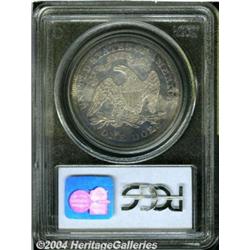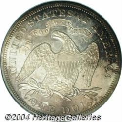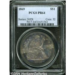 <B>1869<S$1> PR64 PCGS.</B></I> Rich honey-gold, lilac, and sea-green patina invigorates this radiant near-Gem. The right obverse field has a few wispy striations beneath the patina, most of which are mint-made. Liberty's knee and breasts are not completely struck, but the remainder of the design, including the eagle's claws, are boldly impressed. Just 600 proofs were issued. Population: 51 in 64, 28 finer (7/04). <BR><BR><B>Important notice:</B> Heritage usually auctions material at the rate of 200-250 lots per hour. On some occasions eBay Live bid software or the Internet may not be able to keep up with the pace of the auction. We recommend placing a realistic absentee bid now as insurance to avoid disappointment. Occasionally the auctioneer may eliminate or reject an eBay Live bid, and the auctioneer may also reopen a lot after the close of the eBay live bidding (usually because we missed an audience bid), and may reject your bid even if it shows you as the winning bidder. By bidding via eBay Live, you agree that Heritage may award the lot to another bidder at its sole discretion under the circumstances described above or any other reasonable circumstances. Since eBay bids are not shown to us until we open the lot on the floor, we treat those bids just like floor bids. In most cases the floor responds before the eBay bid is presented to us, due to Internet lag time, so for consistency we have made it a policy that floor bids are always considered first over tie eBay live bids. Also please note that all Heritage lots purchased through eBay Live carry a 20% Buyer's Premium. Please make sure you read the Terms and Conditions before you bid. </span></font></tr></table></td></tr></table>