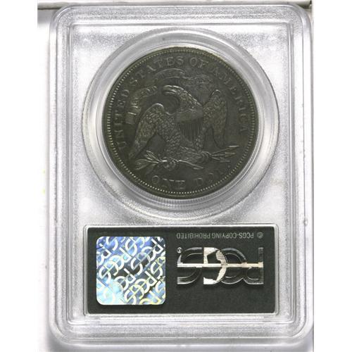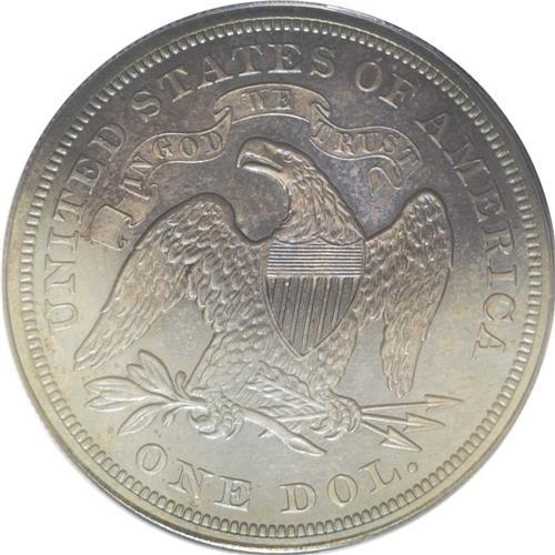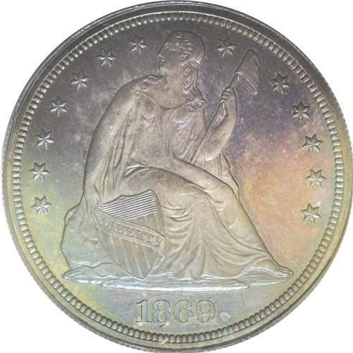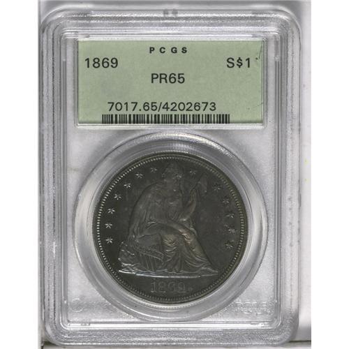 <B>1869<img border='0' src='http://www.heritagecoins.com/images/star.gif' width=10 height=10>$1> PR65 PCGS.</B></I> Only 600 Seated dollar proofs were struck in 1869, and it comes as little surprise that only a slender portion of this production has survived in PR65 or higher grades. Housed in an older PCGS slab, this originally preserved specimen is awash in rich copper-gray toning. Direct angles reveal more vivid sea-green, orange, and plum undertones, as well as the glistening fields that one would expect for proof production methods. Crisply struck in all areas, and devoid of even a single mentionable blemish. A high quality survivor of a Philadelphia Mint silver dollar delivery that is challenging to locate as a high grade business strike. Population: 20 in 65, 6 finer (6/06).<BR><I>From The Belle Glade Collection.</B></I>