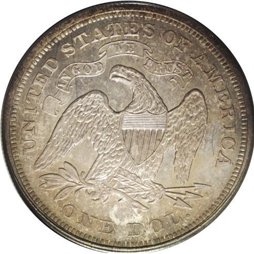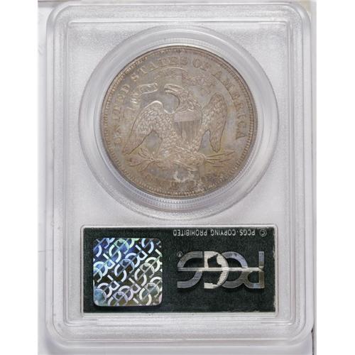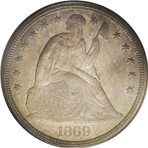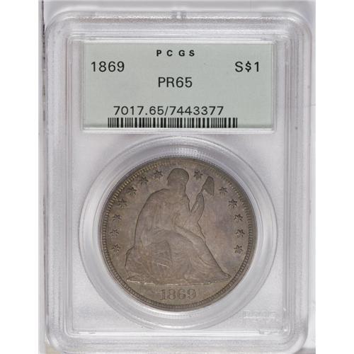 <B>1869<img border='0' src='http://www.heritagecoins.com/images/star.gif' width=10 height=10>$1> PR65 PCGS.</B></I> Proof Motto Seated dollars are popular among type collectors with examples more-or-less available in grades up to and including PR64. Gems, however, are conditionally scarce. Housed in an older PCGS slab with a green insert, this originally preserved specimen is awash in rich copper-gray toning. Direct angles reveal more vivid pink and crimson undertones, as well as the glistening fields that one would expect for proof production methods. Sharply, if not fully struck in all areas, and devoid of even a single mentionable blemish. A high quality survivor of a Philadelphia Mint silver dollar proof production that is even challenging to locate as a high grade business strike. Worth a close look and a carefully planned bid. Population: 20 in 65, 6 finer (7/06).