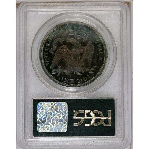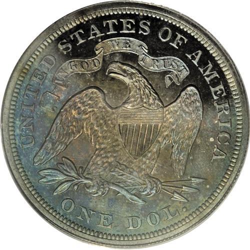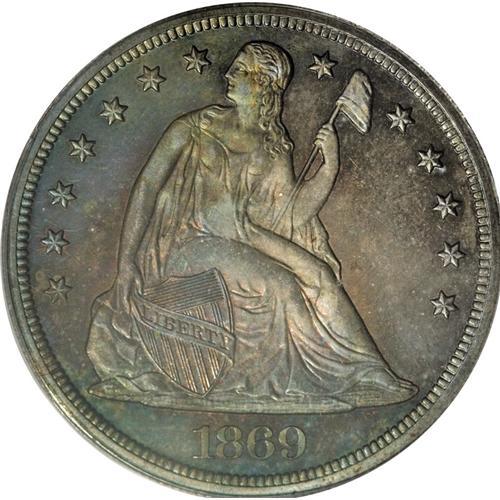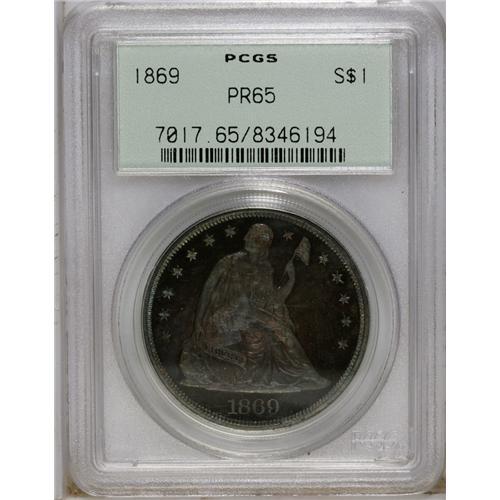 <B>1869 S$1 PR65 PCGS.</B></I> While more than half of the original 600 coin proof mintage has been certified, this date remains a rarity in Gem condition. It is especially desirable due to the rarity of higher quality Mint State pieces. This Gem specimen displays magenta, cobalt-blue, and yellow-gold toning, and is devoid of disturbing marks. Sharp definition is apparent on the design elements, and both sides have exceptional contrast between the fields and devices. Remaining in the green-label PCGS holder from its certification several years ago, this Gem may benefit from a review by the grading service for the possibility of a cameo designation. Population: 19 in 65, 6 finer (2/07).<BR><BR><b>Shipping:</b> Coins & Currency (<a target="_blank" href="http://www.heritageauctions.com/common/shipping.php">view shipping information</a>)