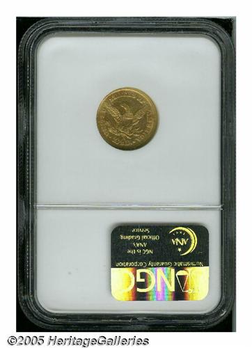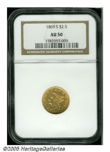 <B>1869-S<$2 1/2> AU50 NGC.</B></I> Weakly struck as usual, with the grade assigned as a result of nearly full luster and light pinkish-gold coloration. This date is elusive in AU or finer grades.
