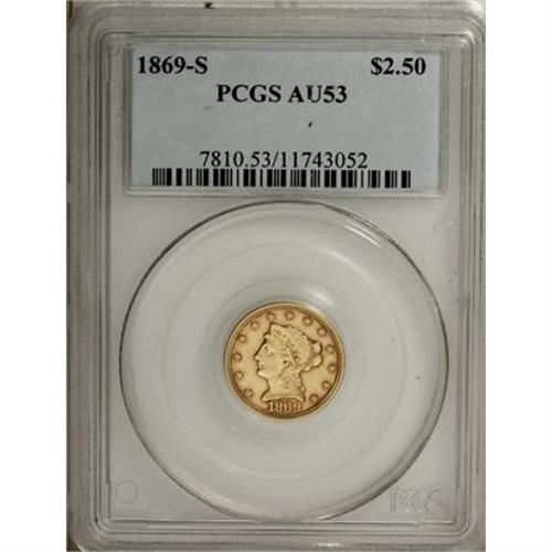 <B>1869-S $2 1/2 AU53 PCGS.</B></I> A bright, beautiful example with rich amber-gold color at the peripheries and lighter color at the centers. With a mintage of just 29,500 pieces, this is a scarce issue in all grades. Some weakness in strike is noted at the centers, as typically seen on this issue.<BR><BR><B>Coin Engraver:</B> Christian Gobrecht<BR><BR><b>Shipping:</b> Coins & Currency (<a target="_blank" href="http://www.heritageauctions.com/common/shipping.php">view shipping information</a>)